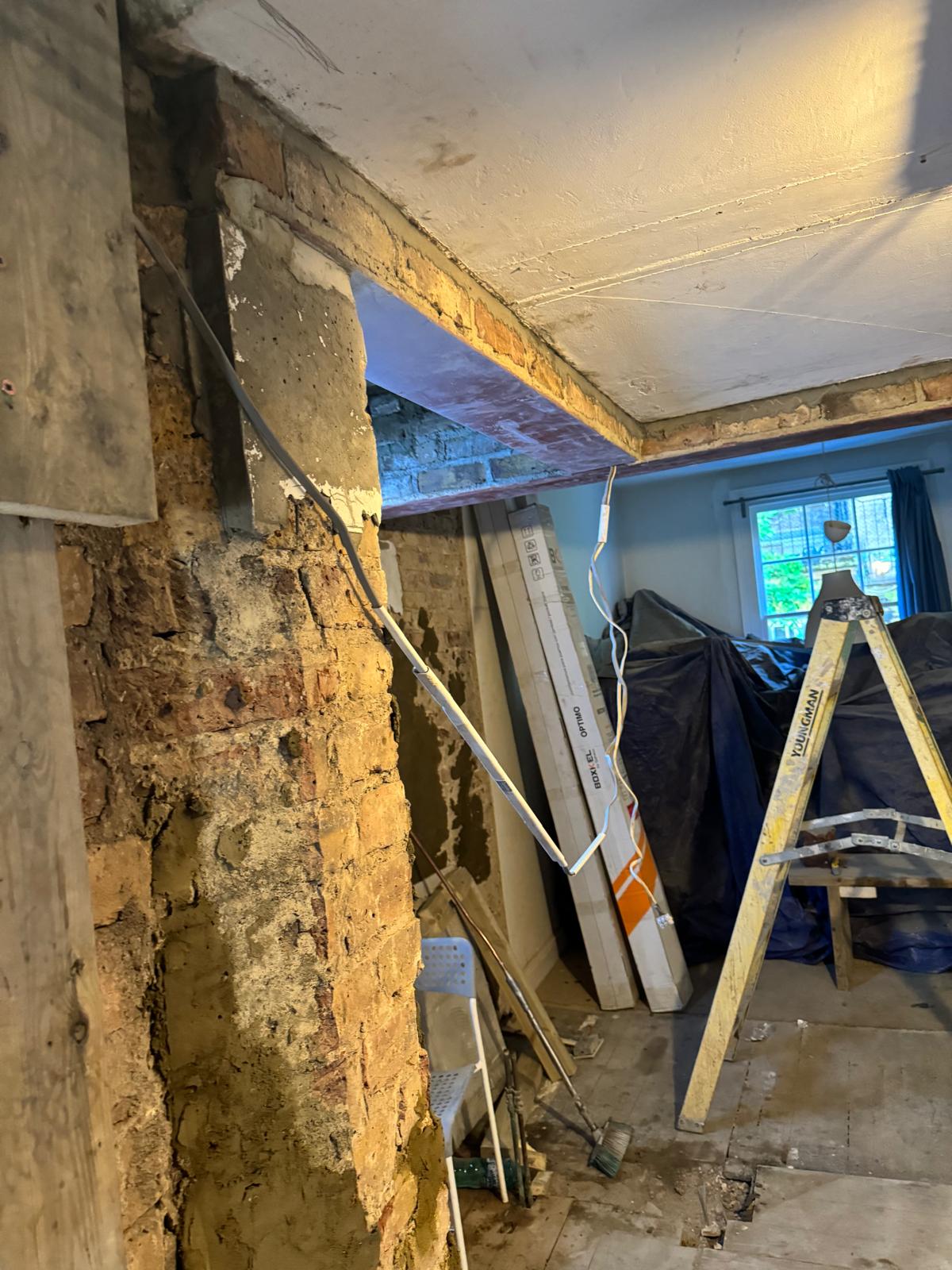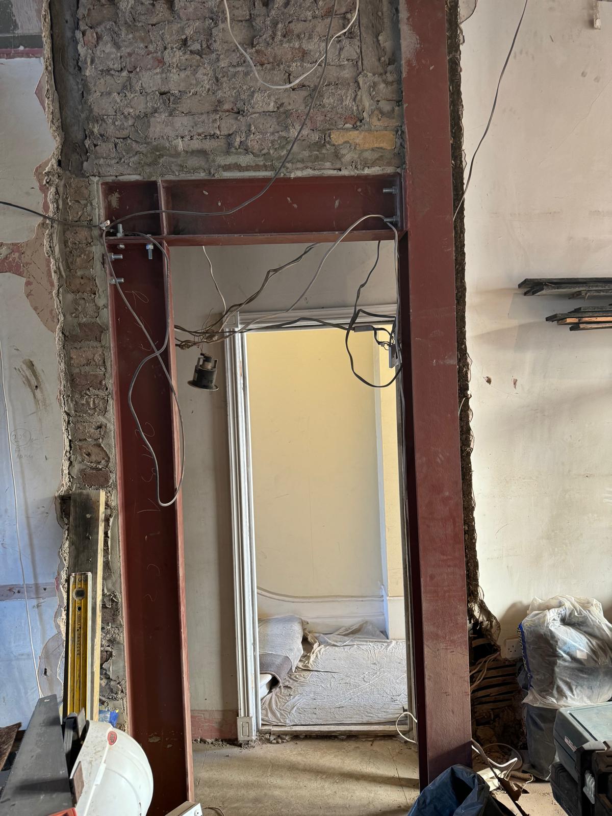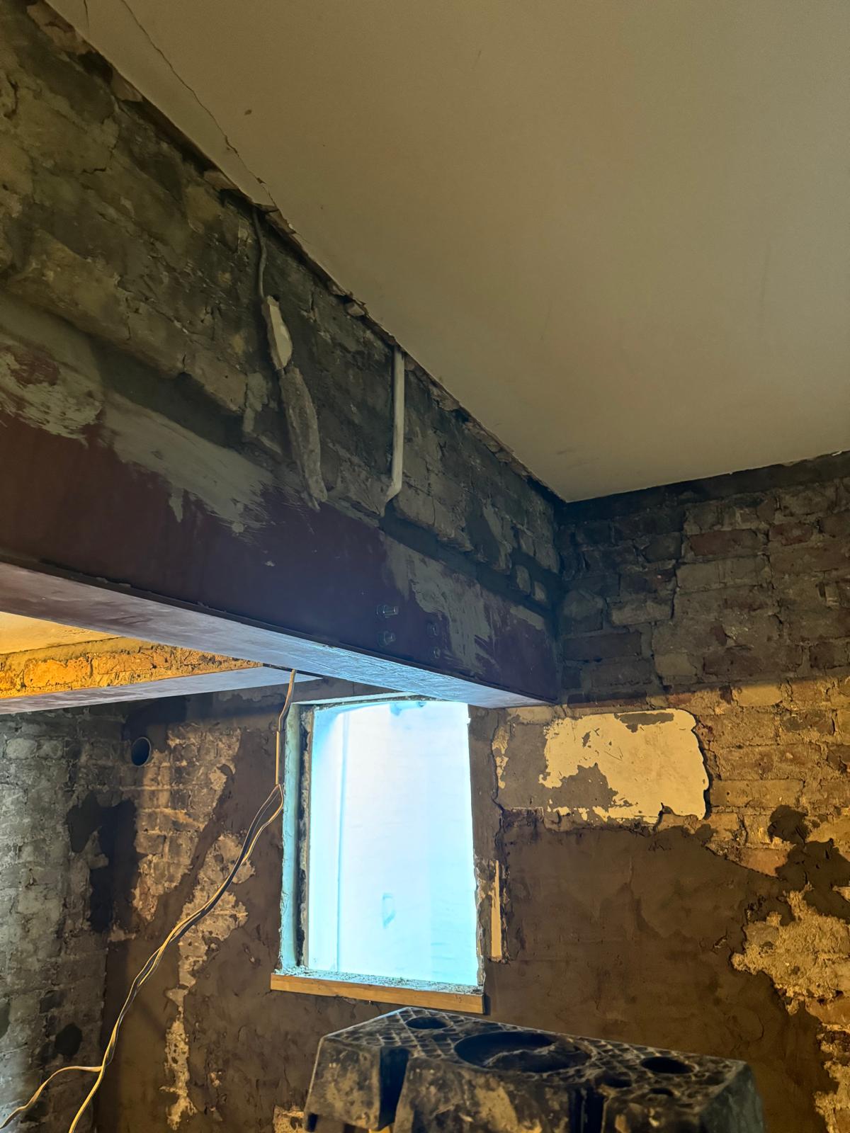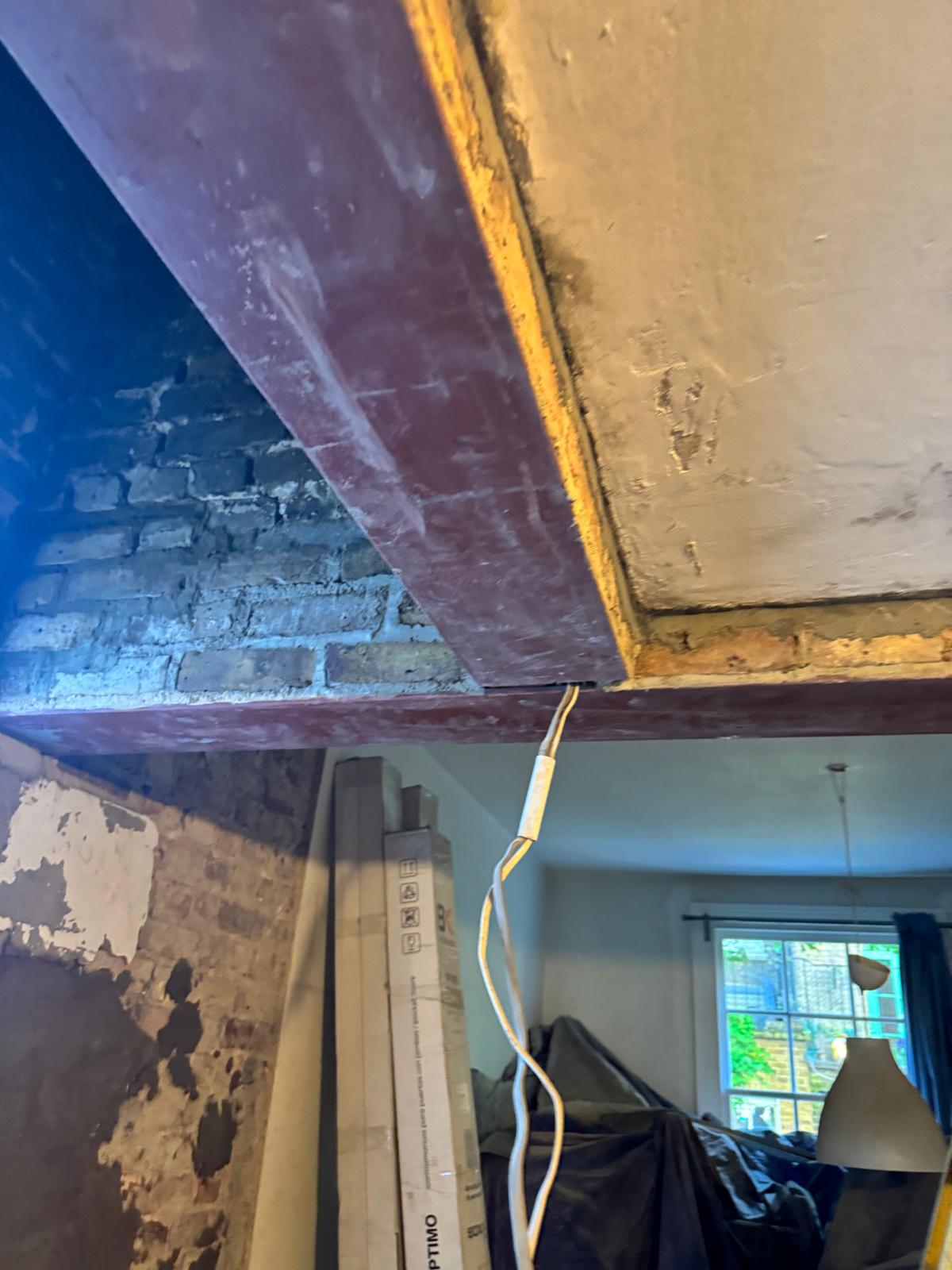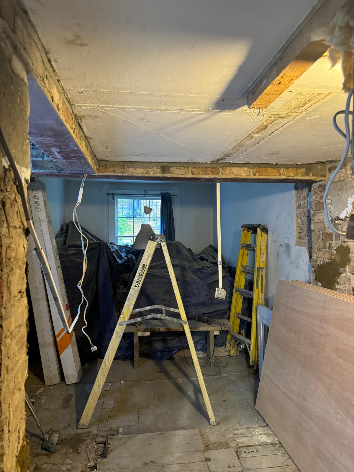 We started by completely stripping out the existing interior — removing internal walls, ceilings, and the old chimney structure. Because the layout was tight and the ceilings were low, the job required precision and experience. New steel beams were installed to support the modified structure, opening up the space and allowing for better light flow throughout the flat.