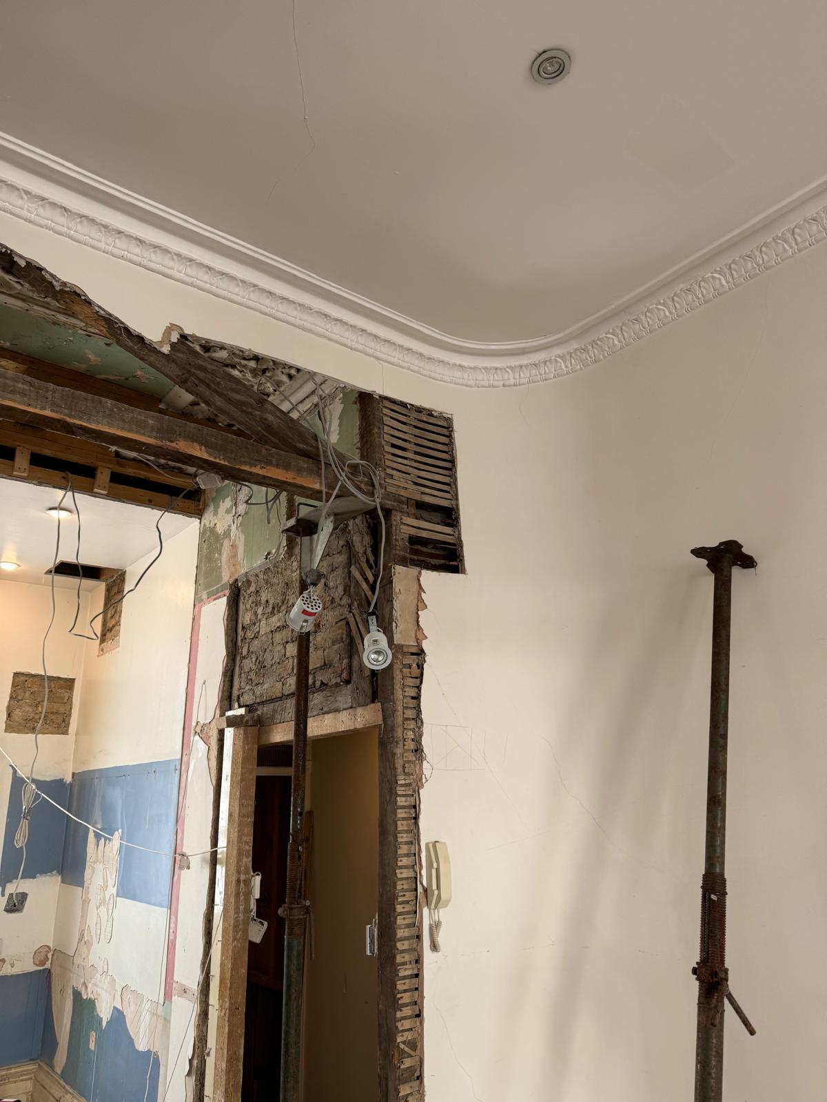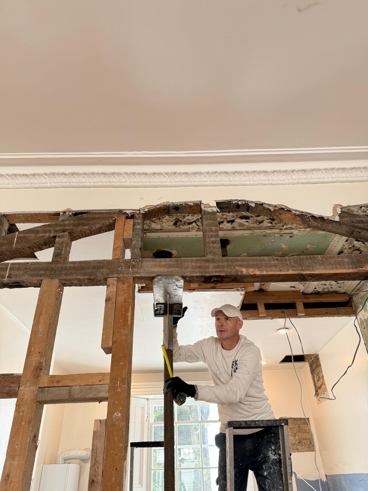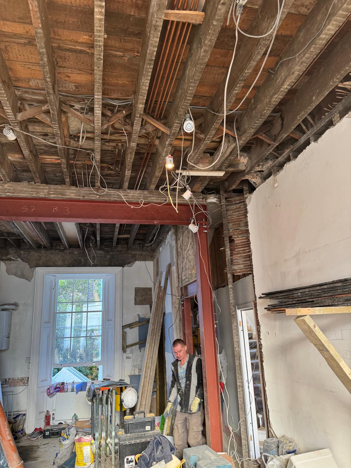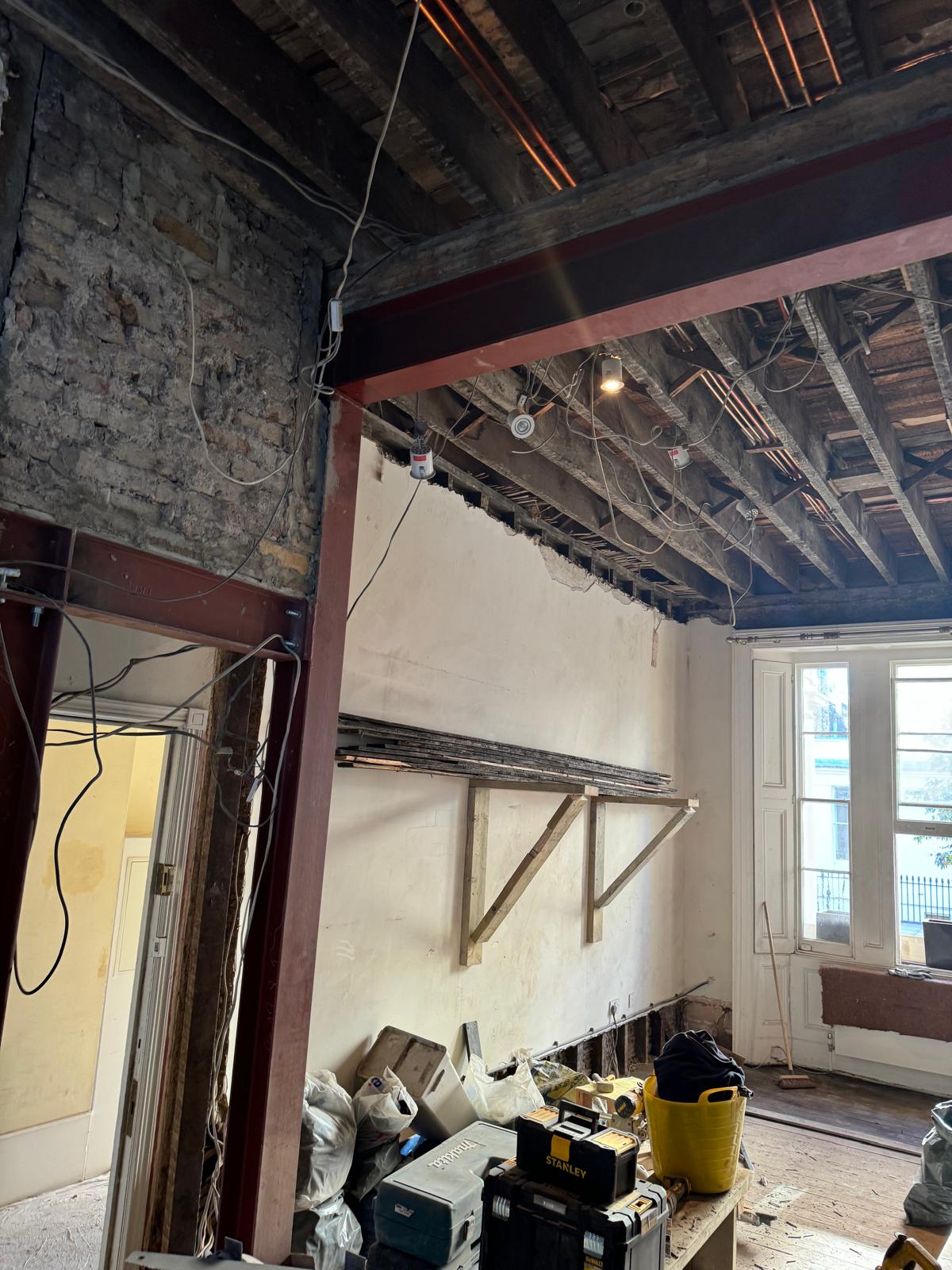 We started by completely stripping out the existing interior — removing internal walls, ceilings, and the old chimney structure. Because the layout was tight and the ceilings were low, the job required precision and experience. New steel beams were installed to support the modified structure, opening up the space and allowing for better light flow throughout the flat.