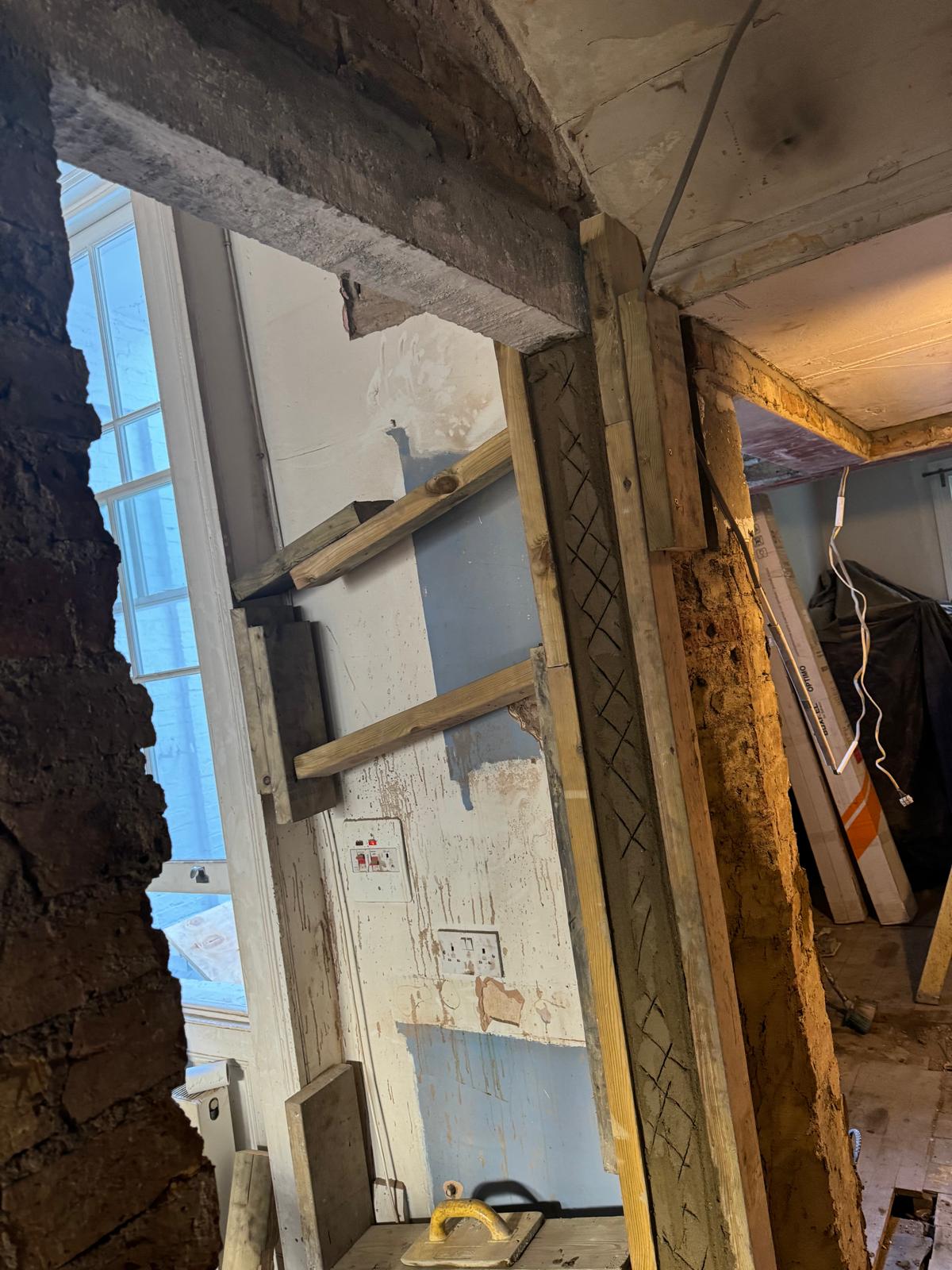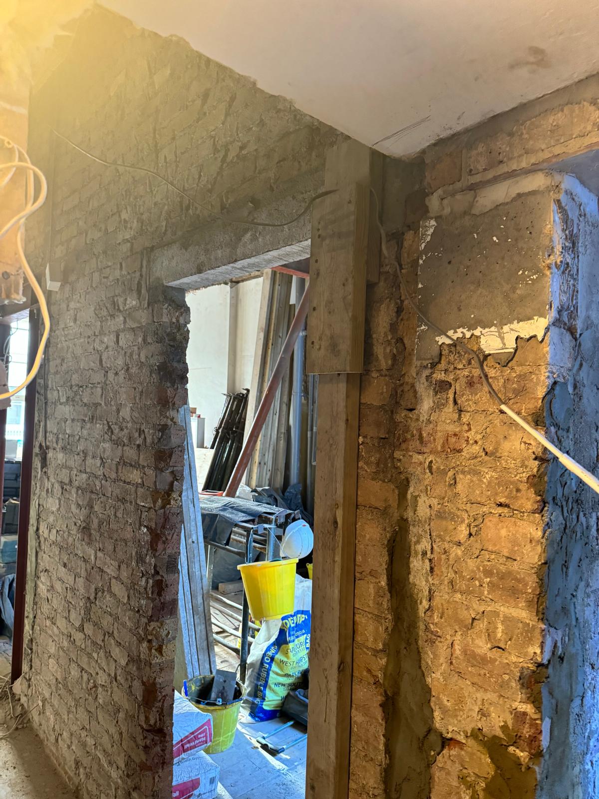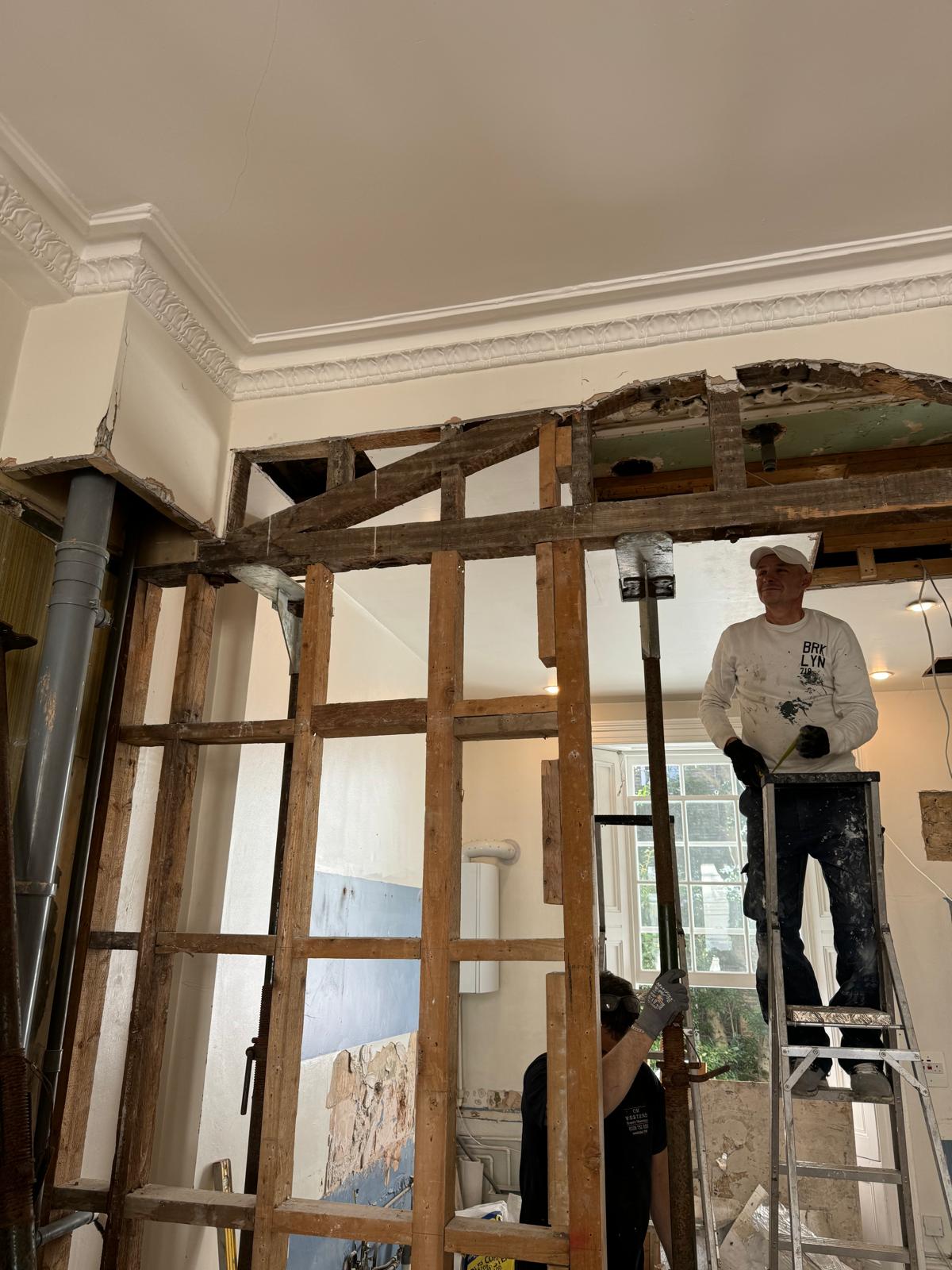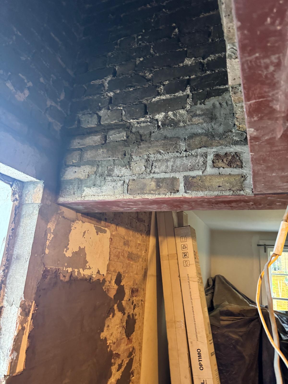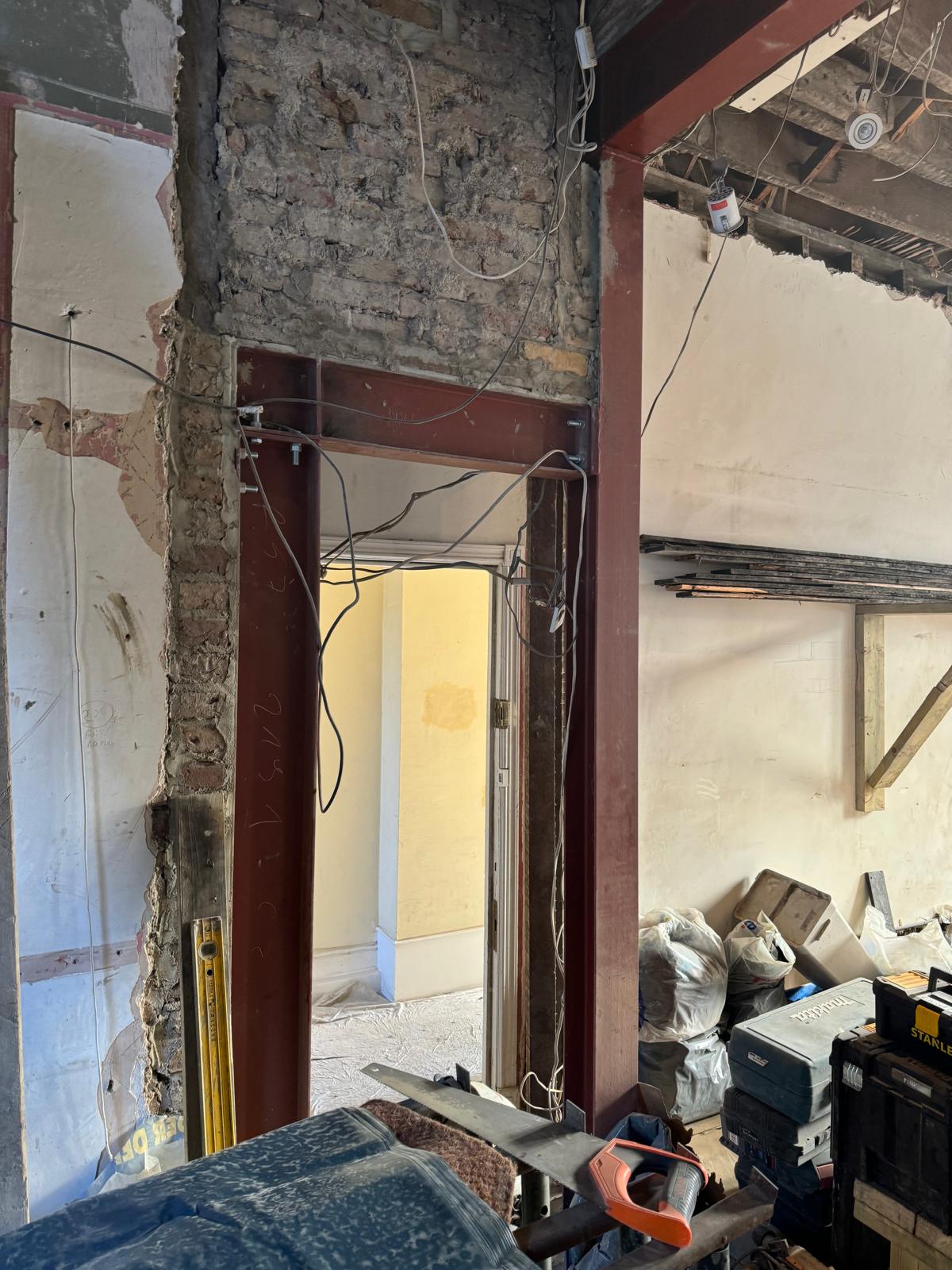 We started by completely stripping out the existing interior — removing internal walls, ceilings, and the old chimney structure. Because the layout was tight and the ceilings were low, the job required precision and experience. New steel beams were installed to support the modified structure, opening up the space and allowing for better light flow throughout the flat.