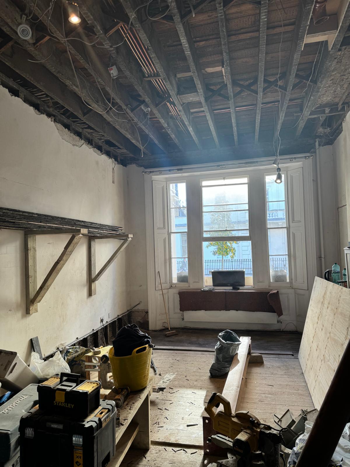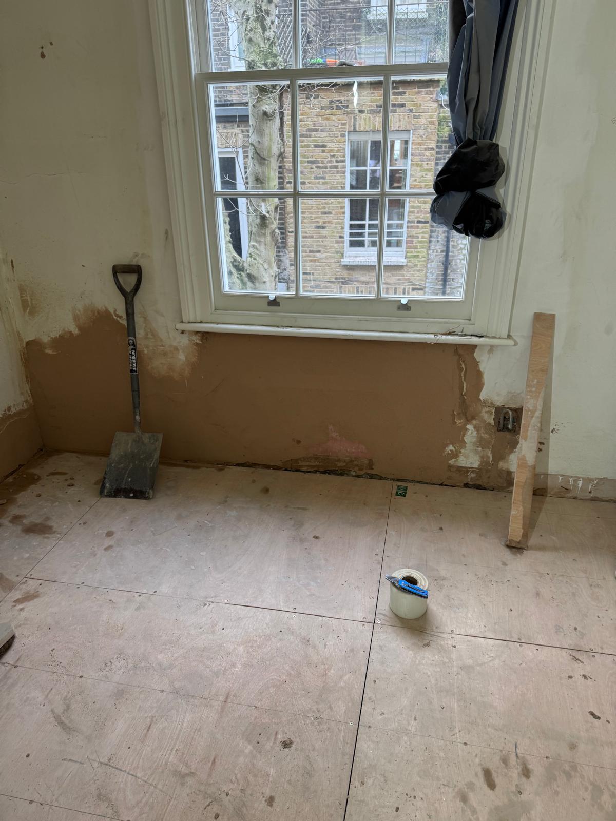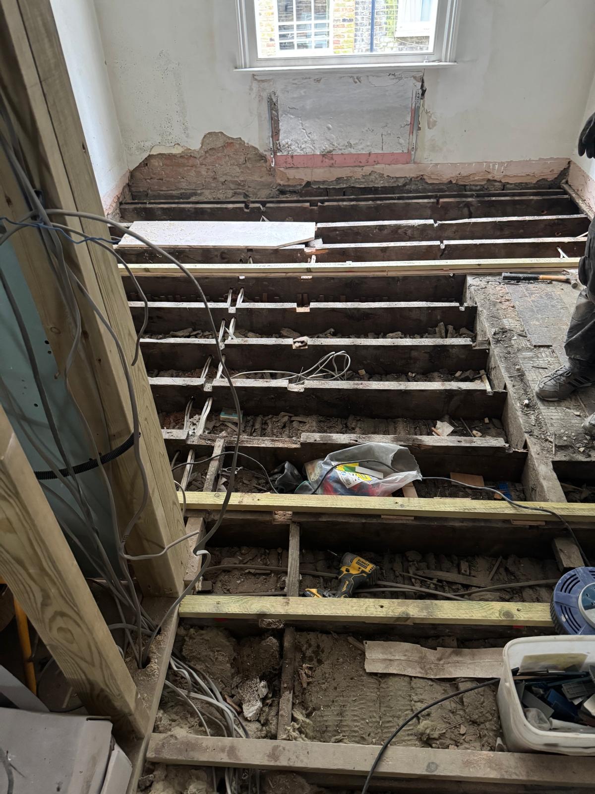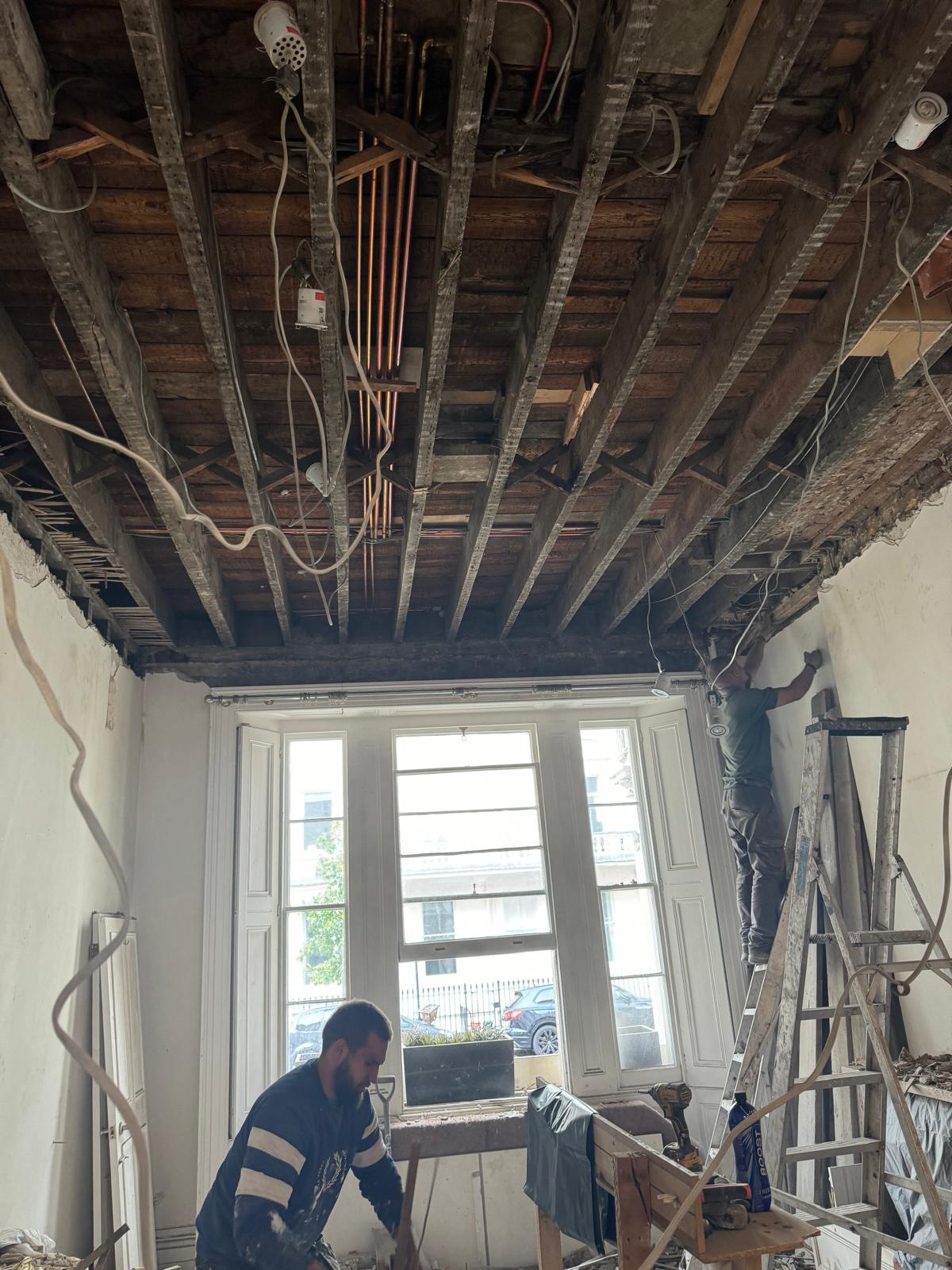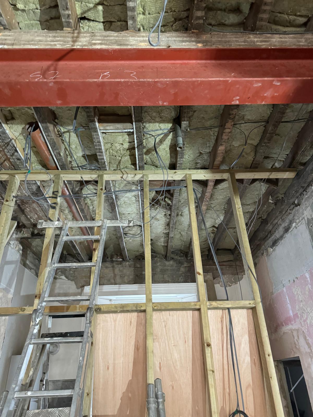 We started by completely stripping out the existing interior — removing internal walls, ceilings, and the old chimney structure. Because the layout was tight and the ceilings were low, the job required precision and experience. New steel beams were installed to support the modified structure, opening up the space and allowing for better light flow throughout the flat.