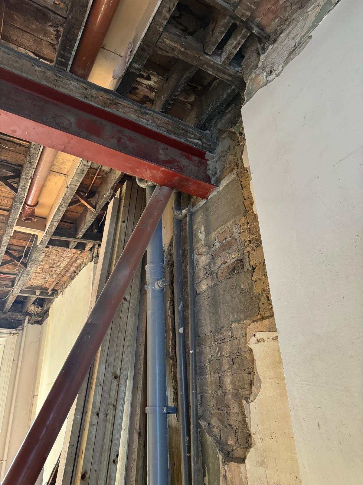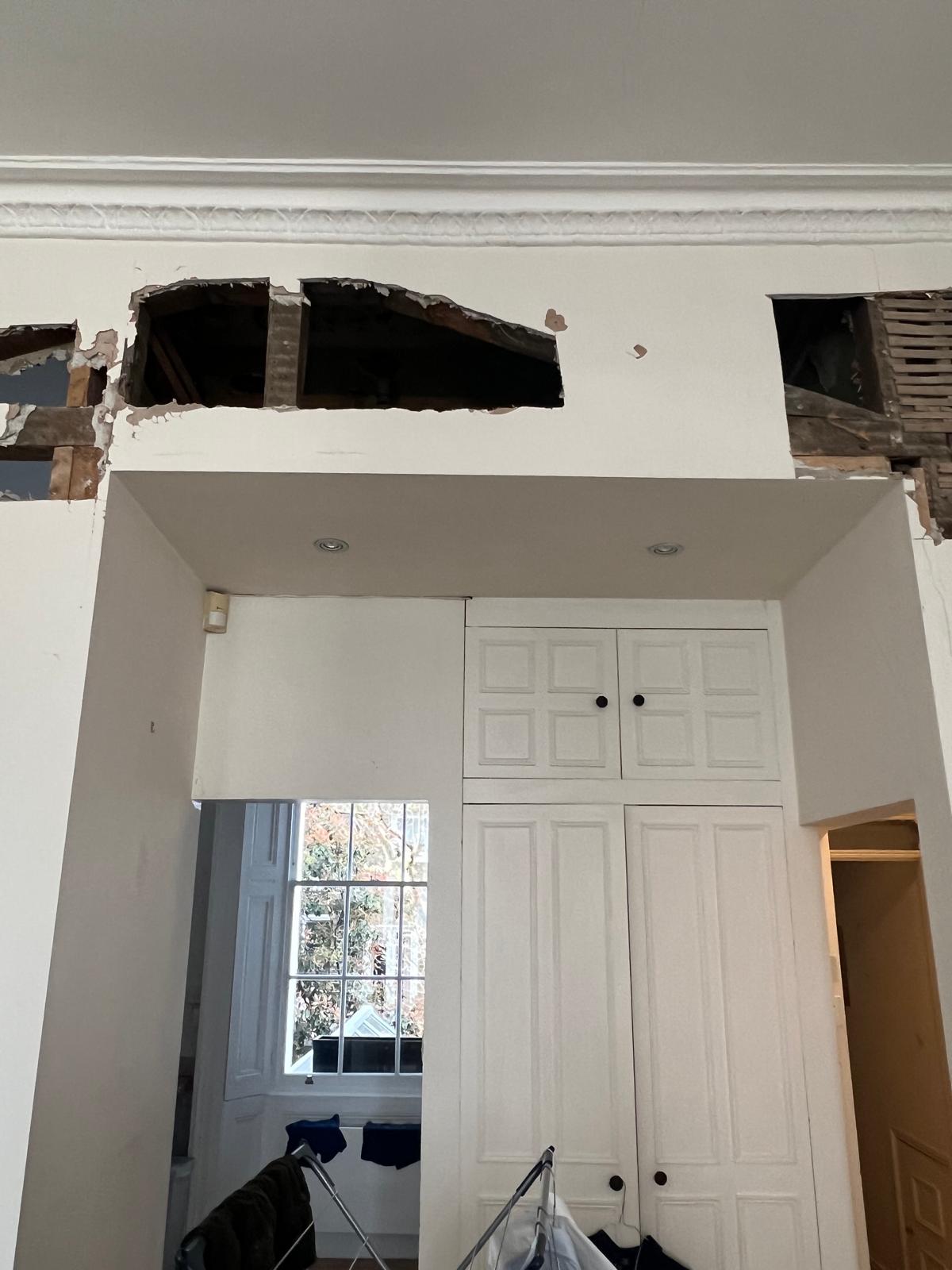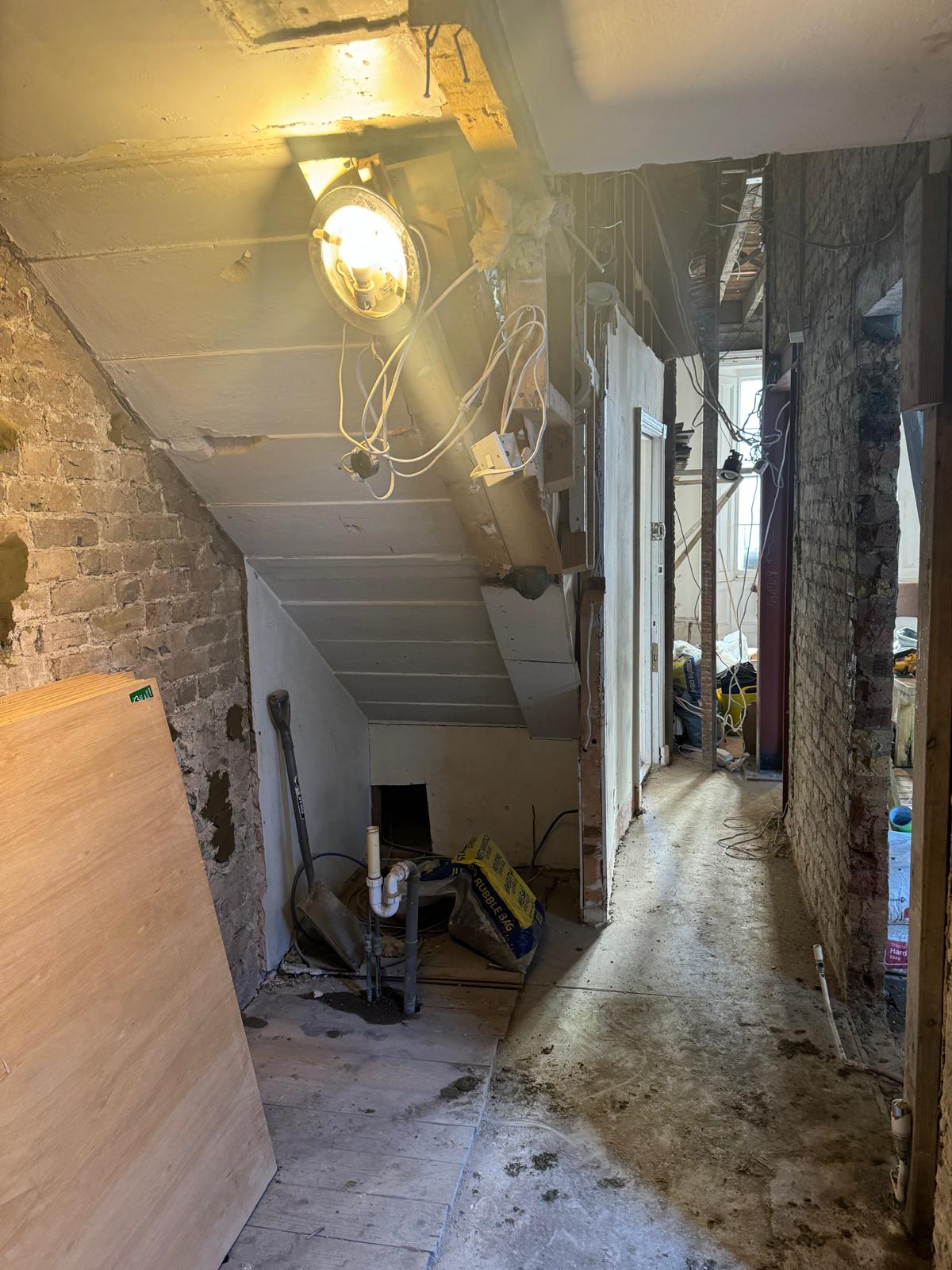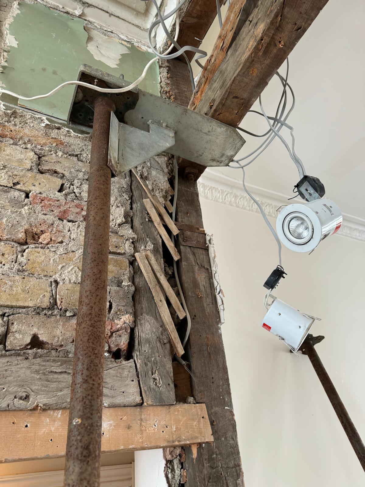 We started by completely stripping out the existing interior — removing internal walls, ceilings, and the old chimney structure. Because the layout was tight and the ceilings were low, the job required precision and experience. New steel beams were installed to support the modified structure, opening up the space and allowing for better light flow throughout the flat.
