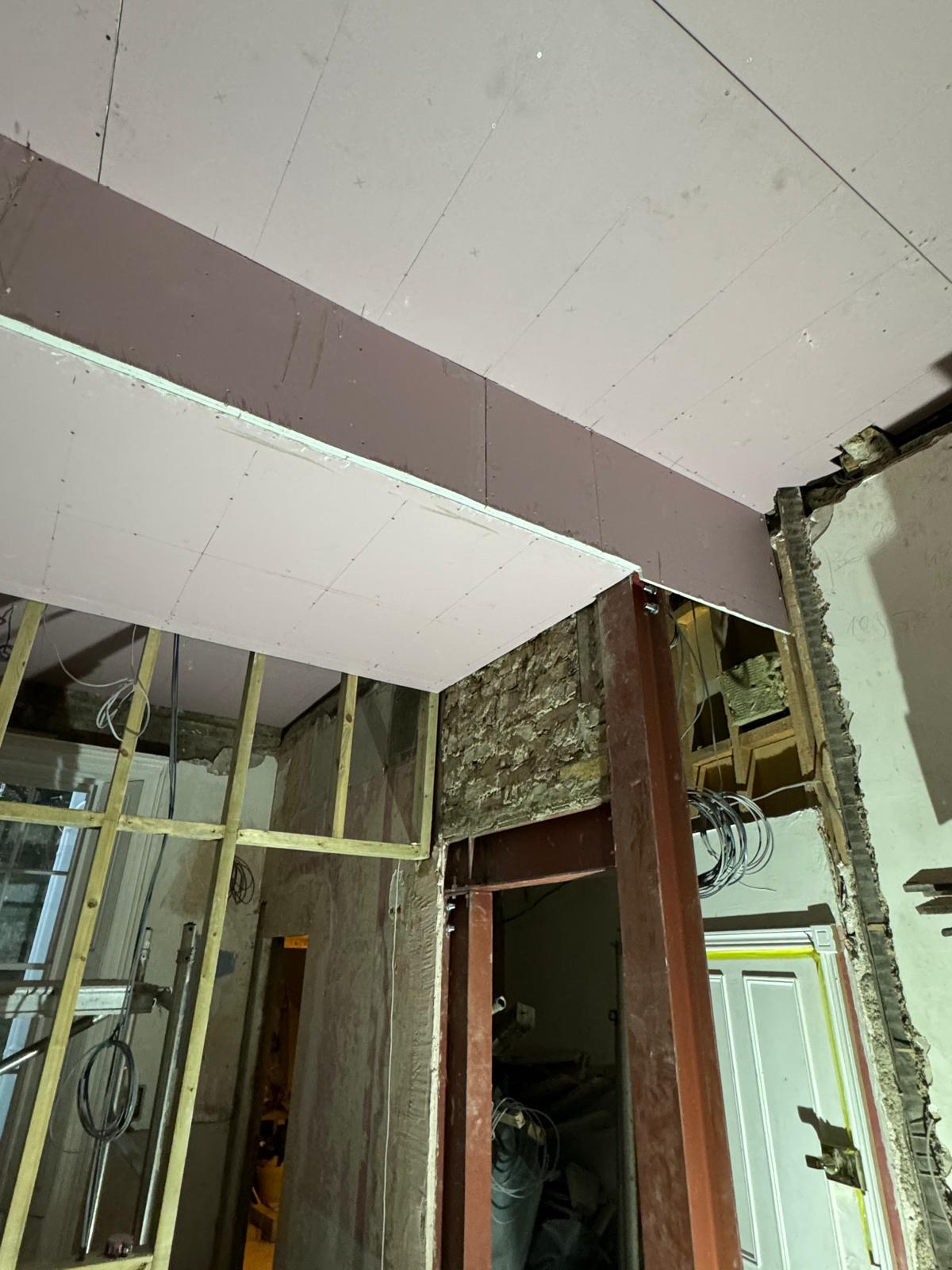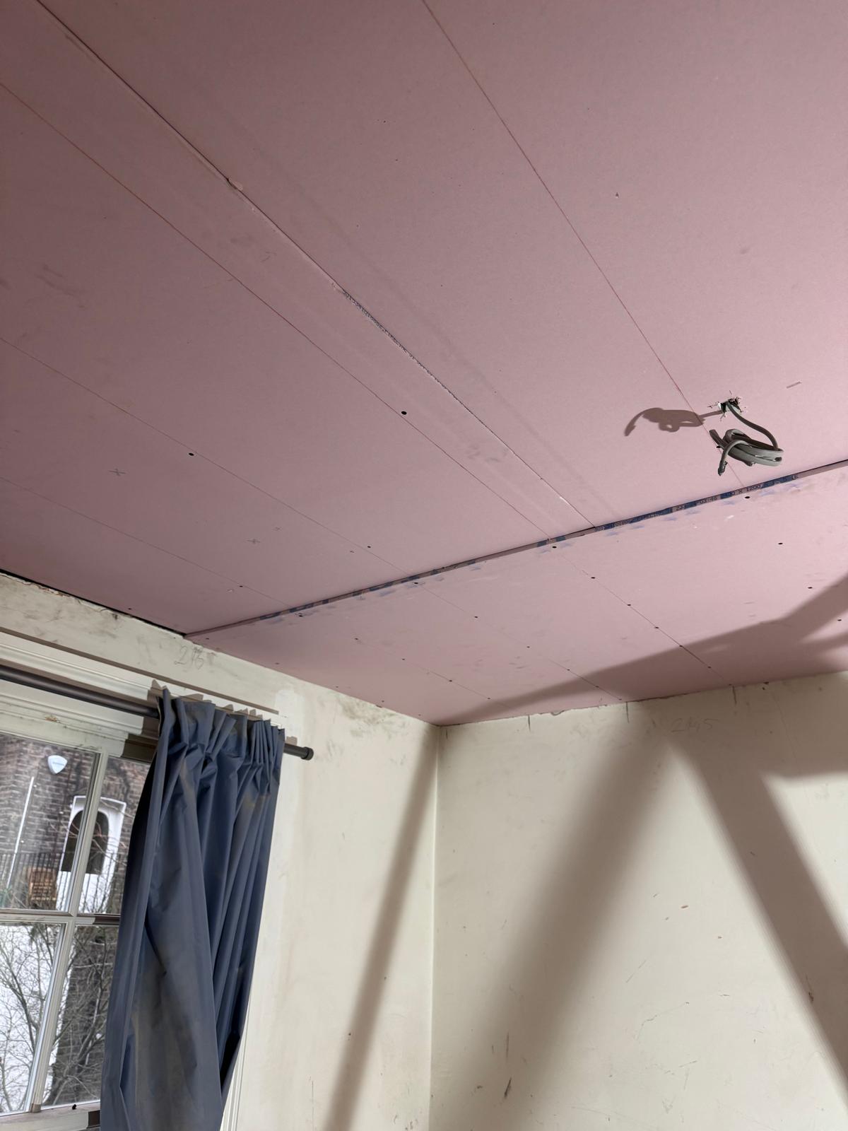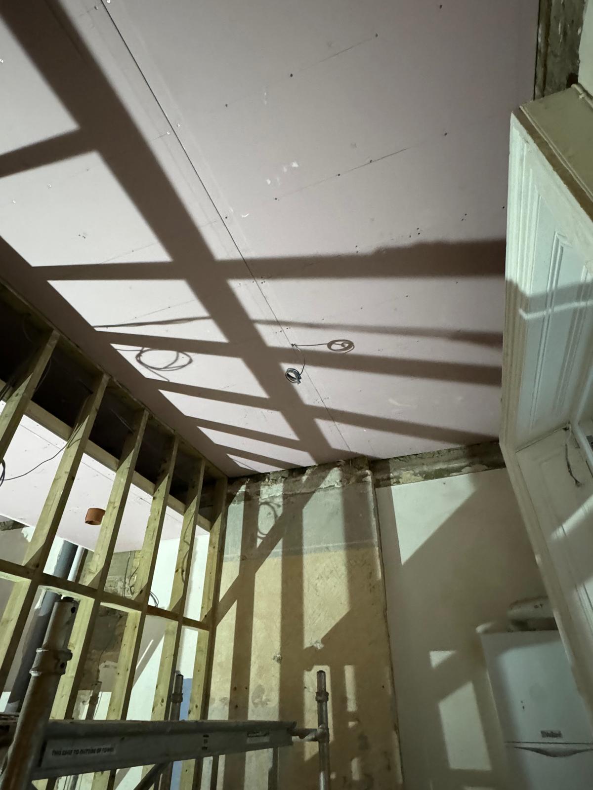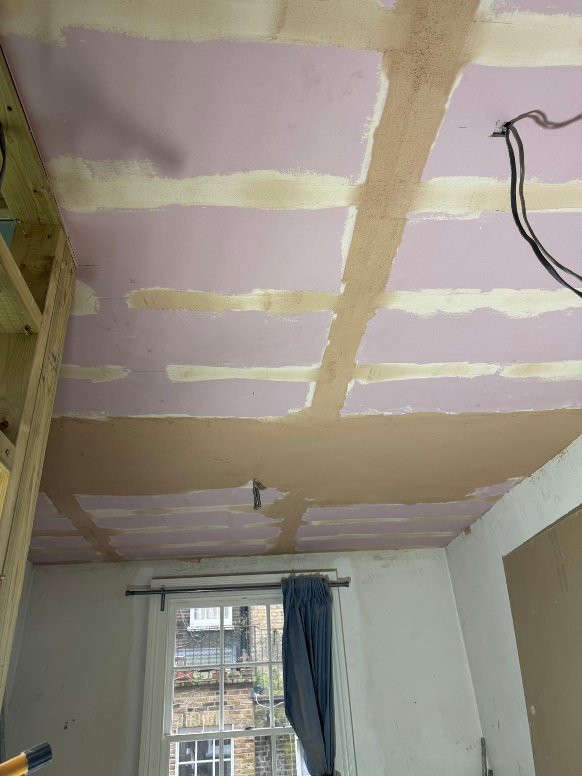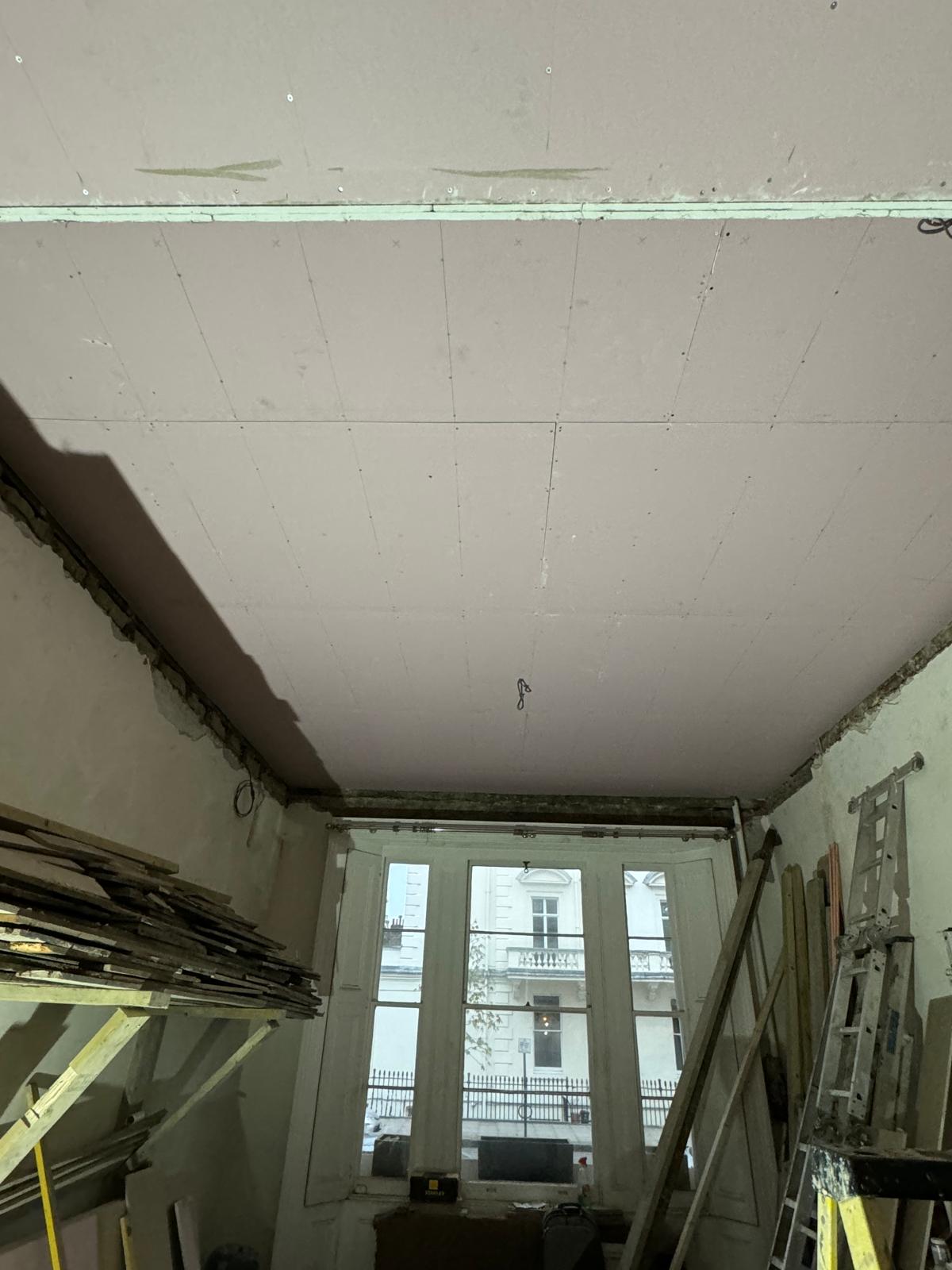 All ceilings were rebuilt with new timber framing and fitted with acoustic insulation to reduce noise between floors. We then installed fire-rated plasterboards for safety and durability. Old cracked walls were reinforced with plaster mesh before being re-plastered to achieve a perfectly smooth finish.