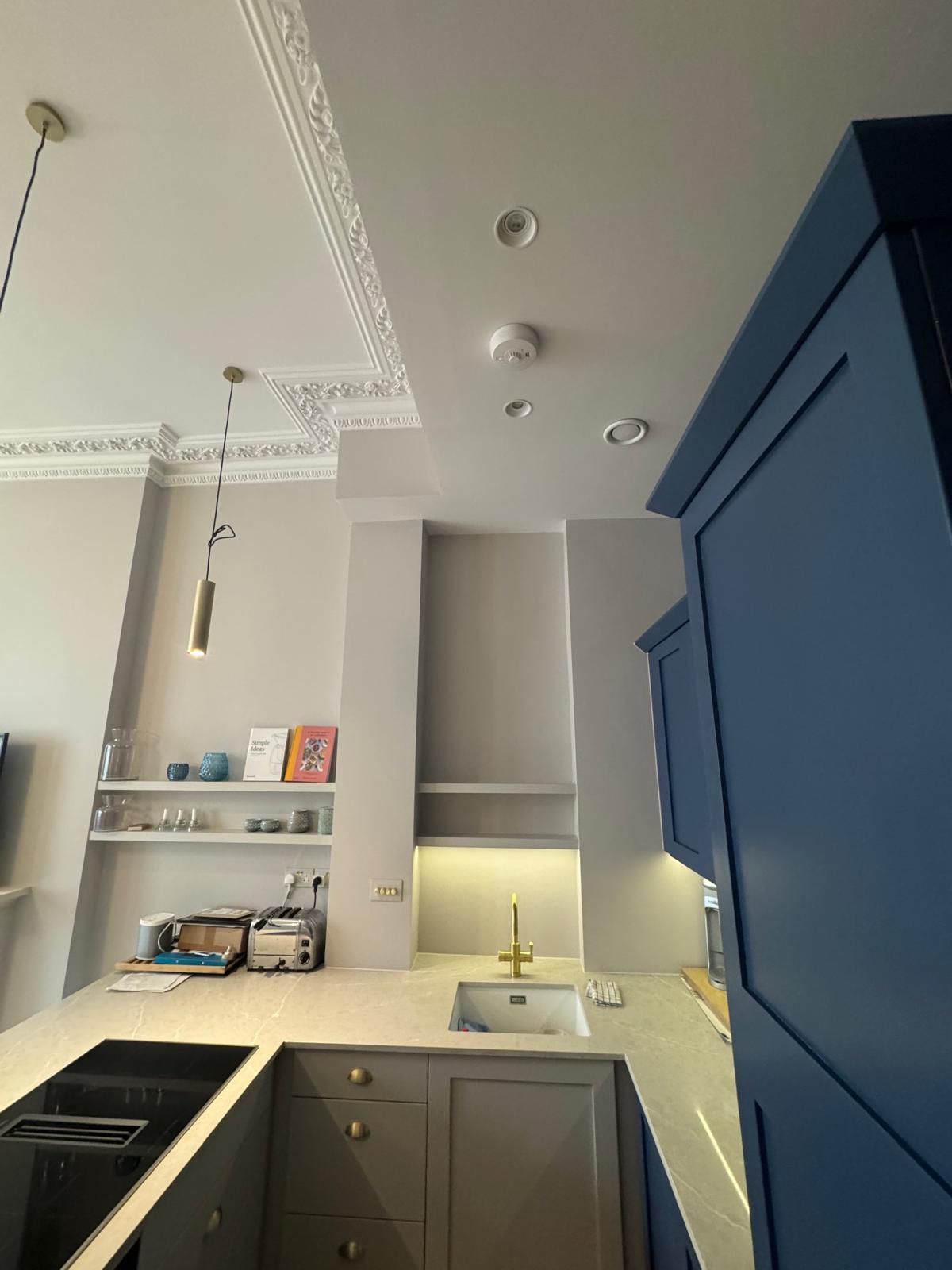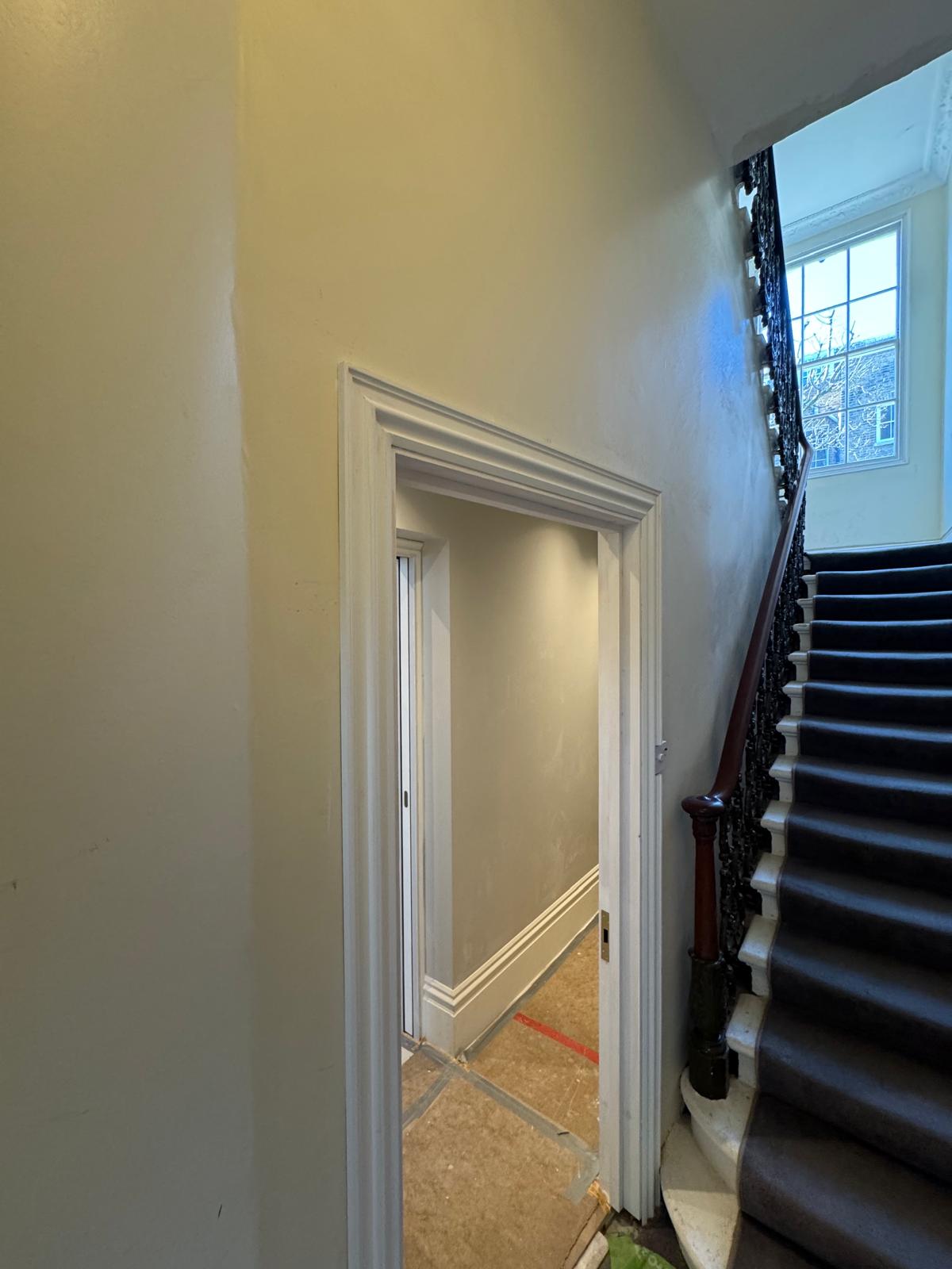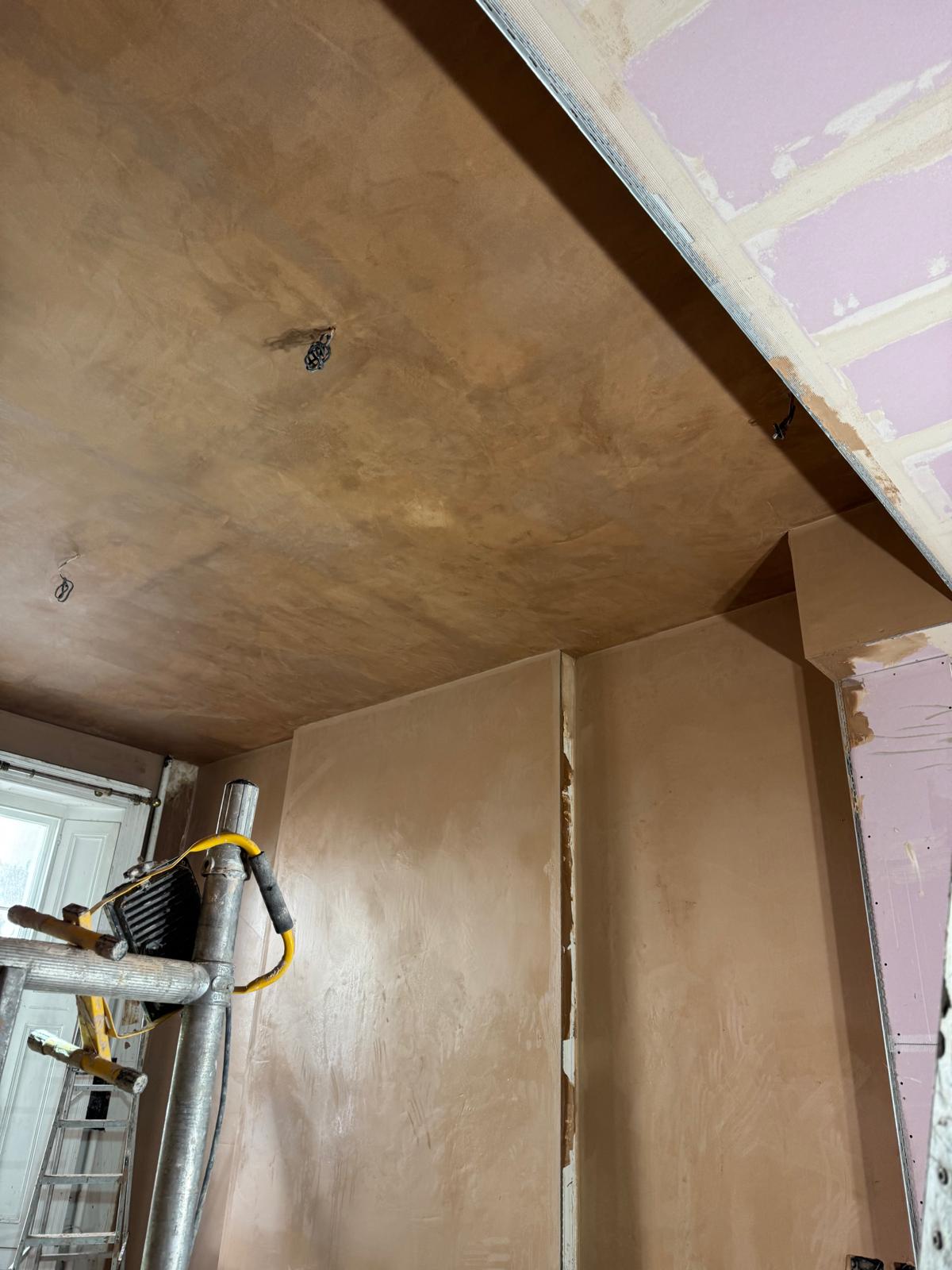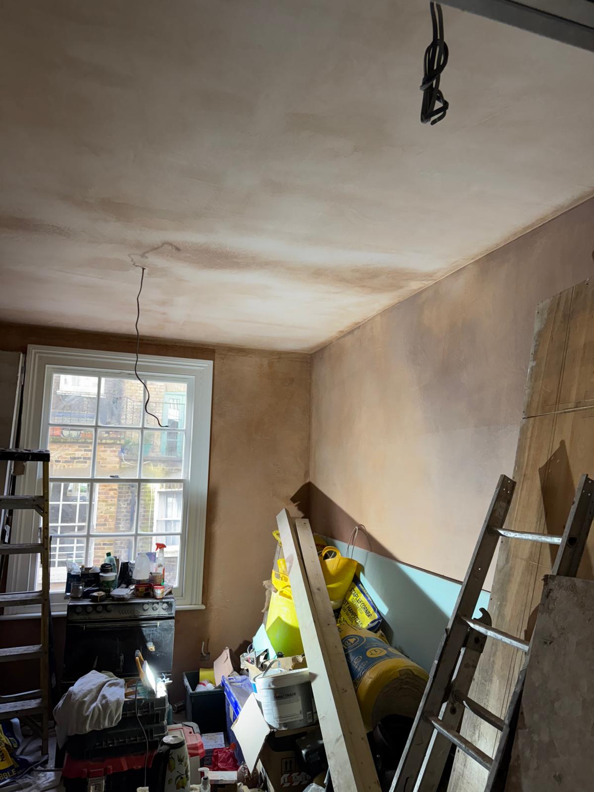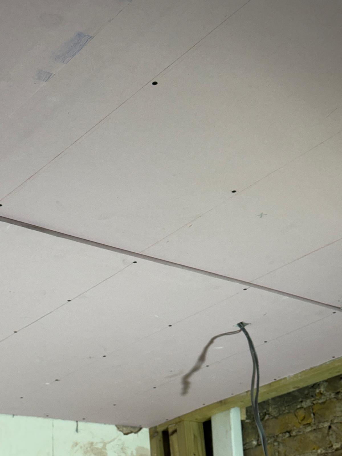 All ceilings were rebuilt with new timber framing and fitted with acoustic insulation to reduce noise between floors. We then installed fire-rated plasterboards for safety and durability. Old cracked walls were reinforced with plaster mesh before being re-plastered to achieve a perfectly smooth finish.
