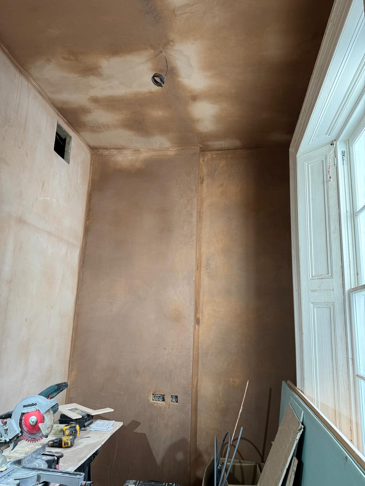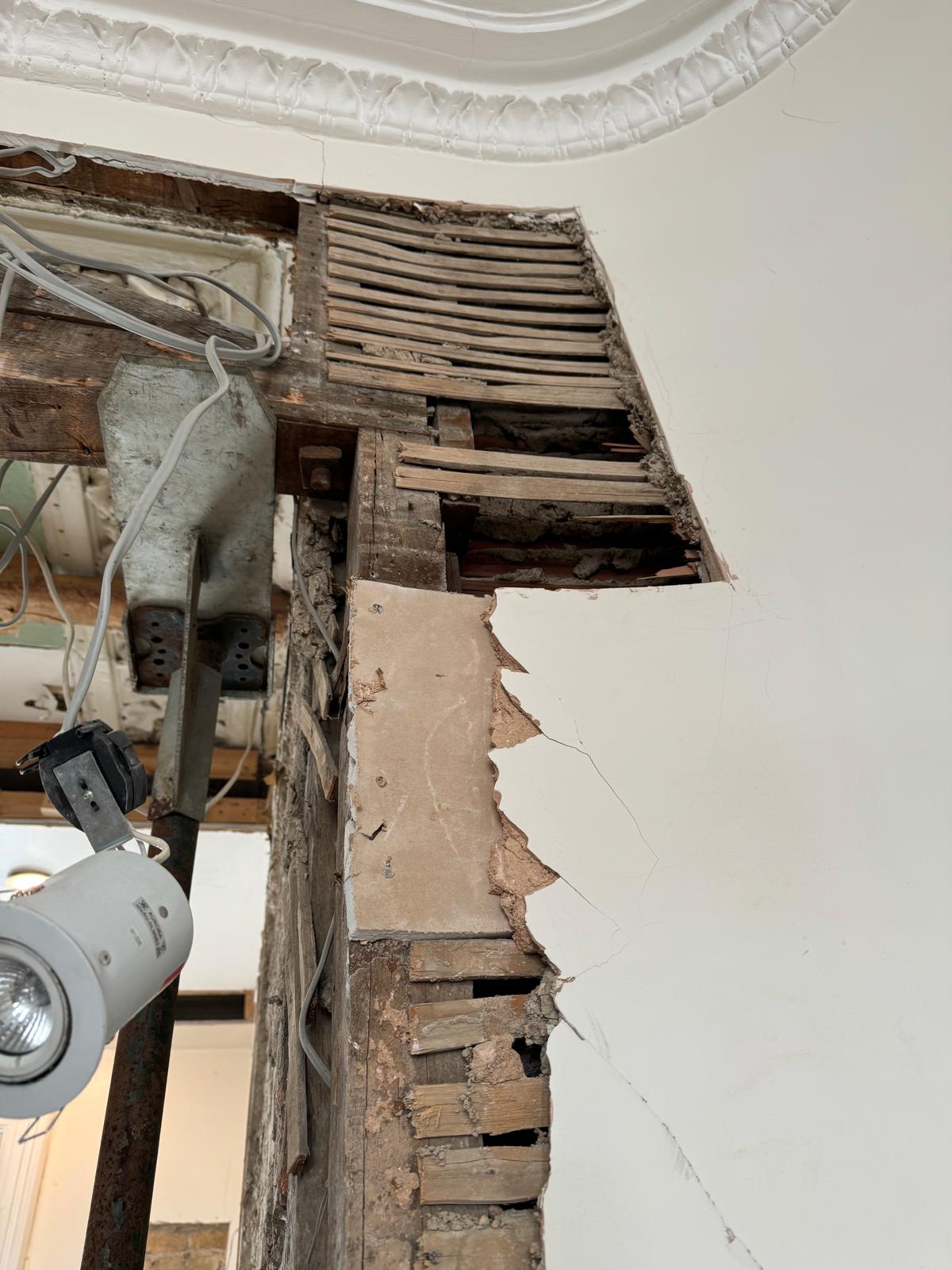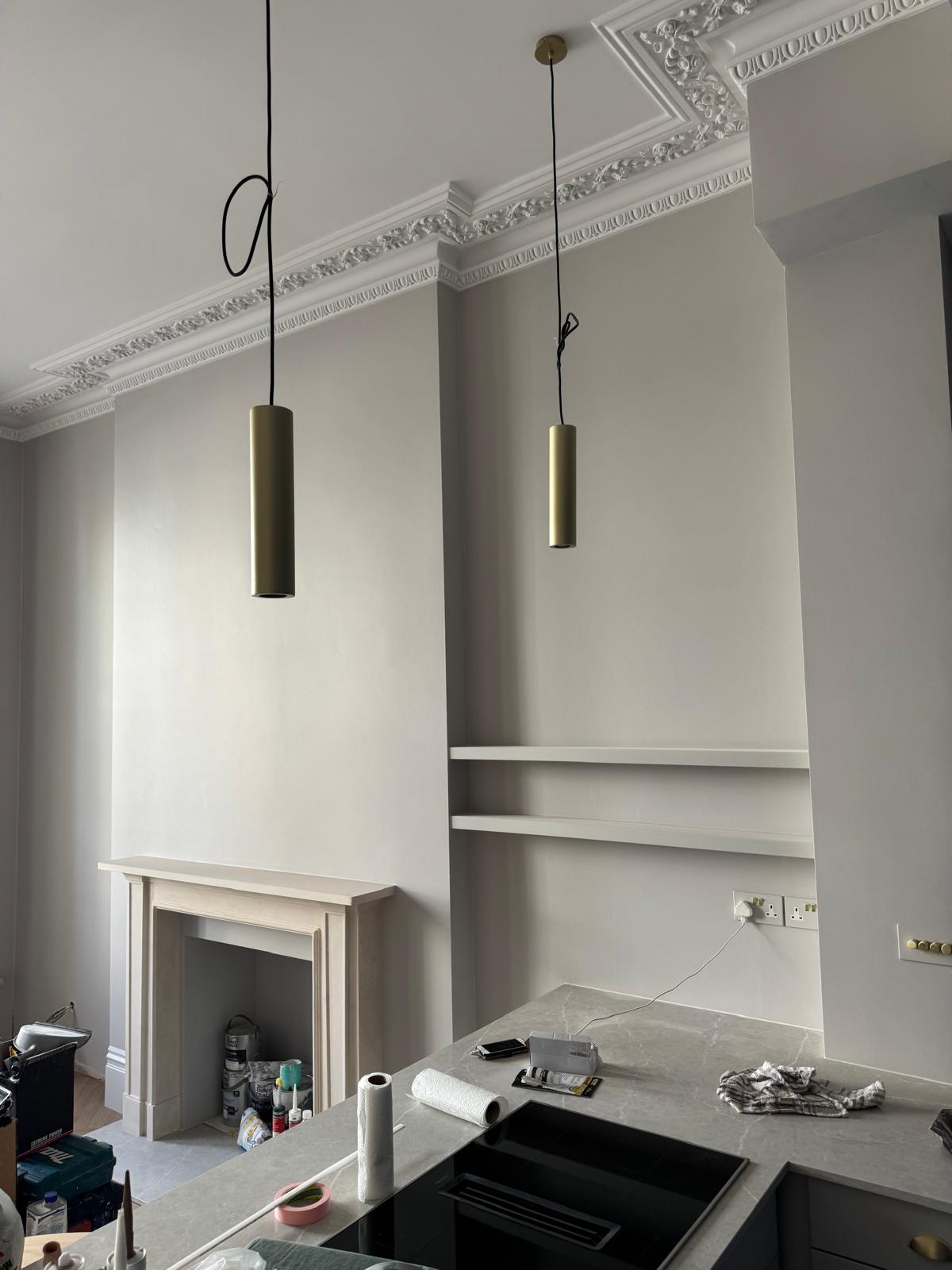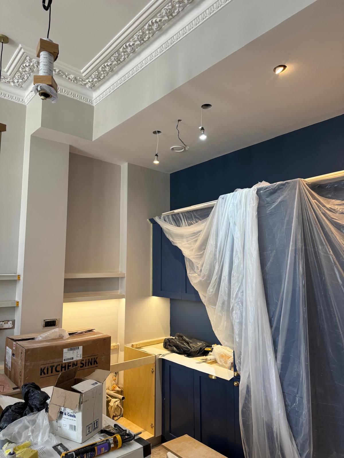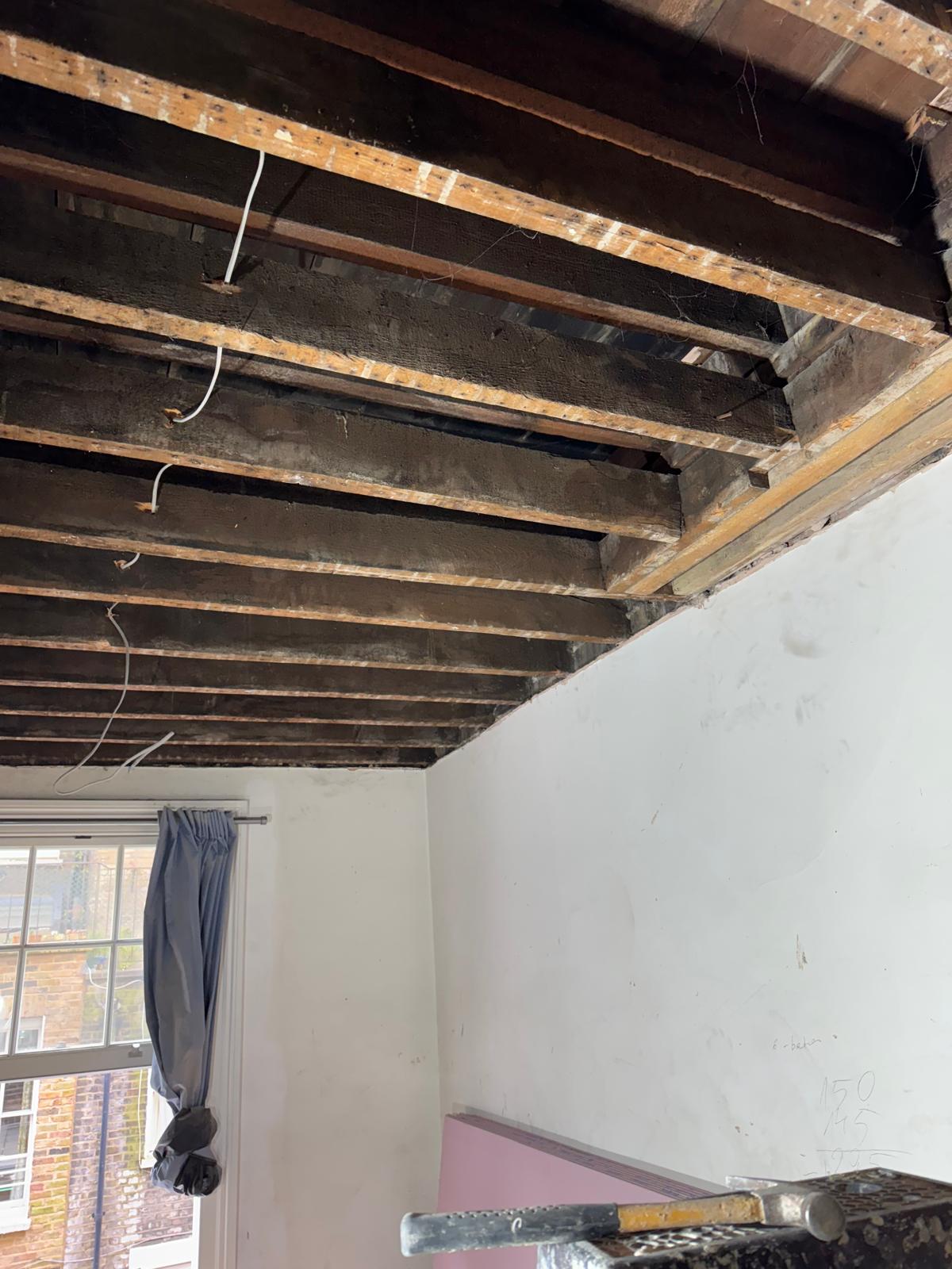 All ceilings were rebuilt with new timber framing and fitted with acoustic insulation to reduce noise between floors. We then installed fire-rated plasterboards for safety and durability. Old cracked walls were reinforced with plaster mesh before being re-plastered to achieve a perfectly smooth finish.