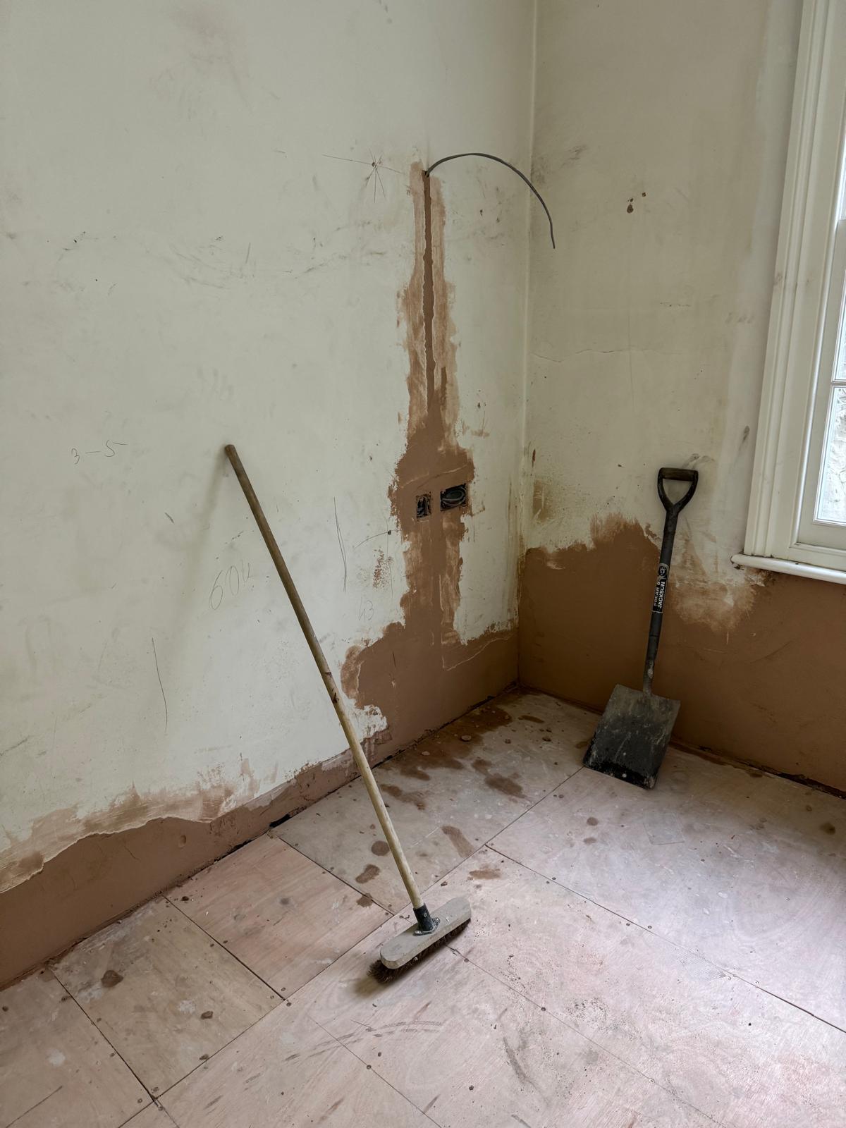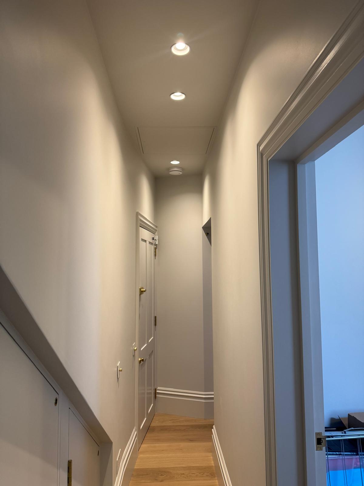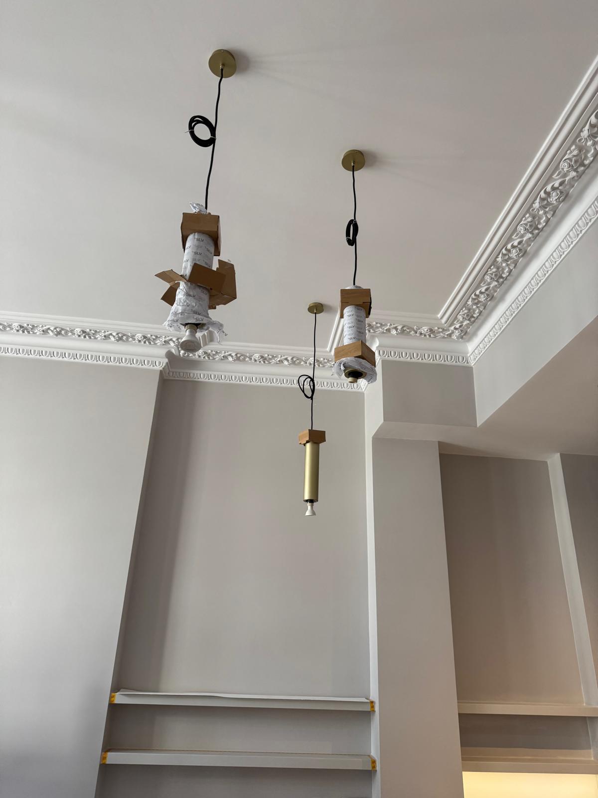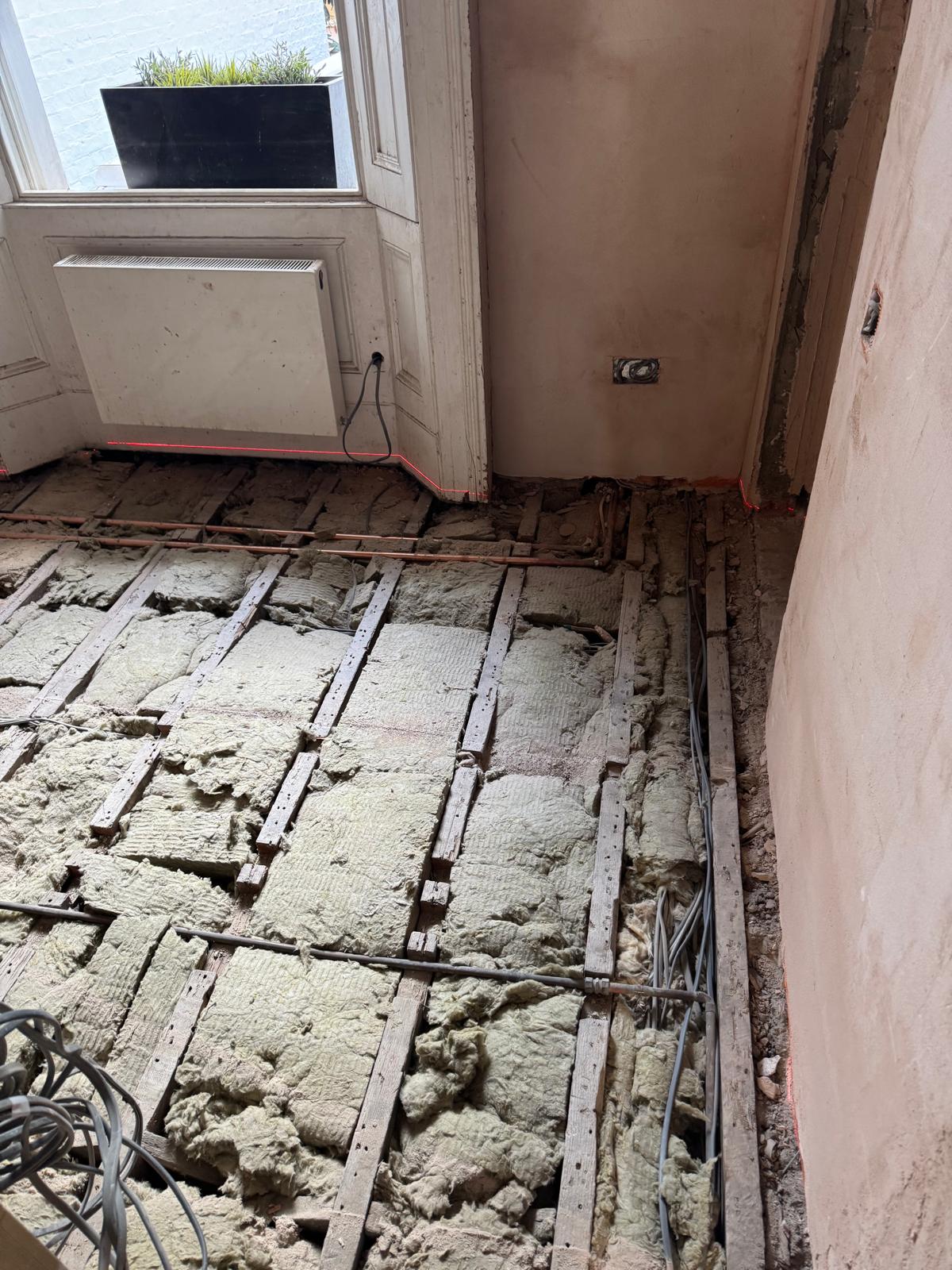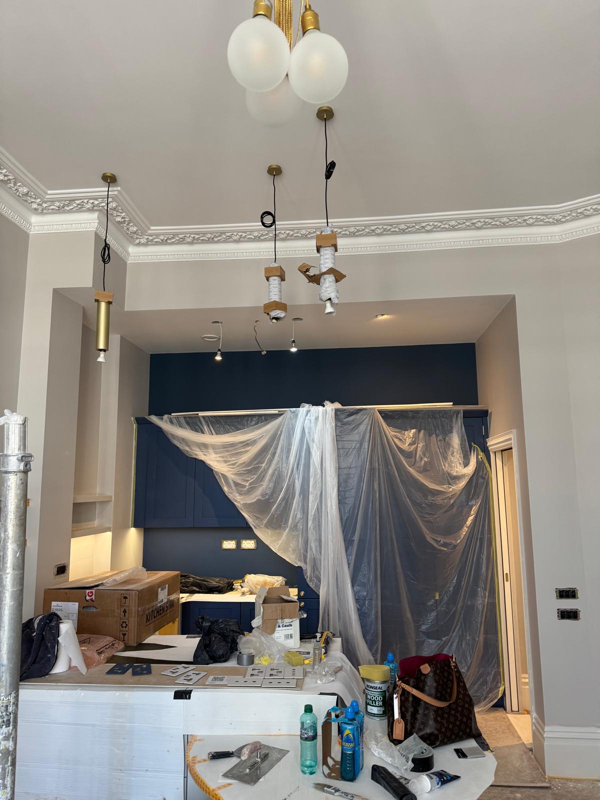 All ceilings were rebuilt with new timber framing and fitted with acoustic insulation to reduce noise between floors. We then installed fire-rated plasterboards for safety and durability. Old cracked walls were reinforced with plaster mesh before being re-plastered to achieve a perfectly smooth finish.
