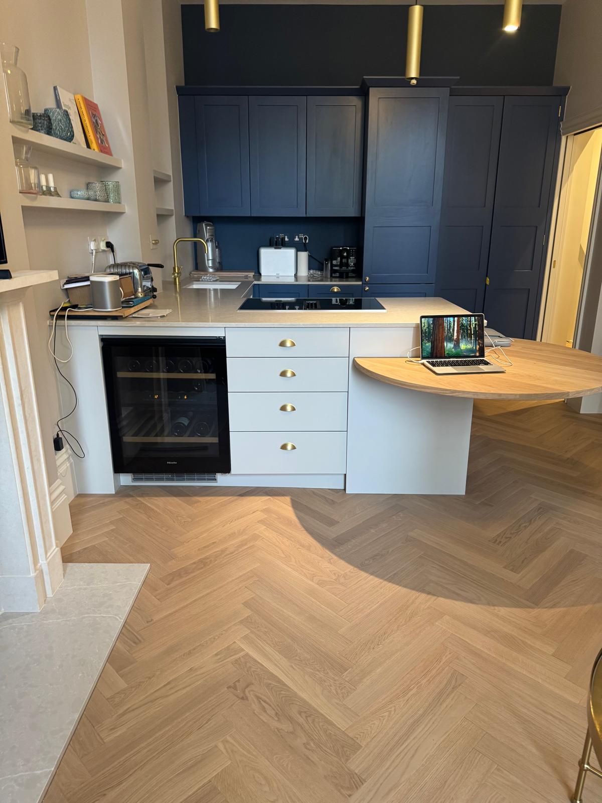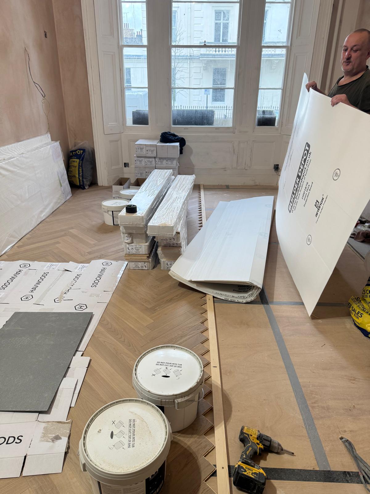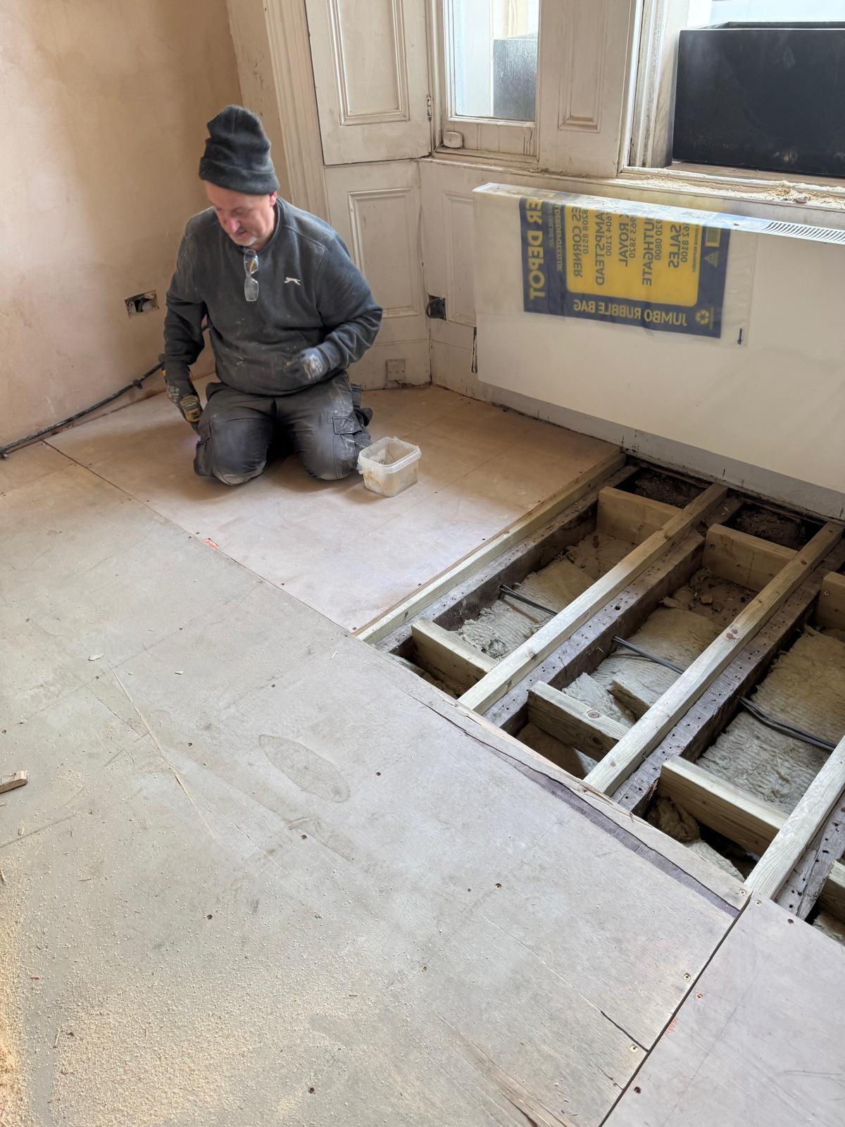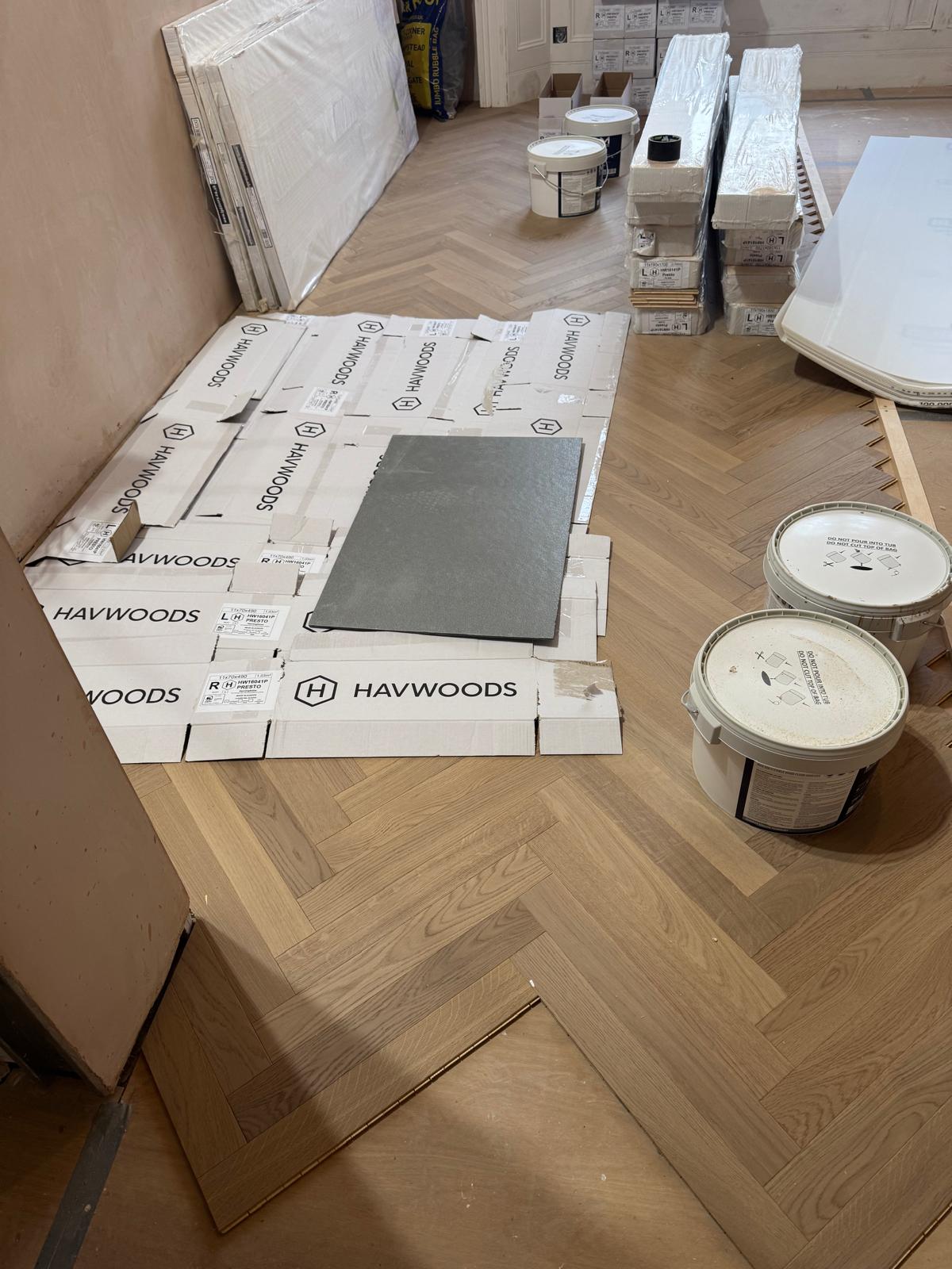 The floors in this flat had seen better days — uneven, creaky, and far from level. We stripped everything back, adjusted the subfloor, and added new plywood to make the structure solid again. Once the base was right, we installed beautiful parquet flooring throughout. The difference was immediate — the new floor completely changed the feel of the apartment, adding warmth and a sense of craftsmanship that ties the rooms together.