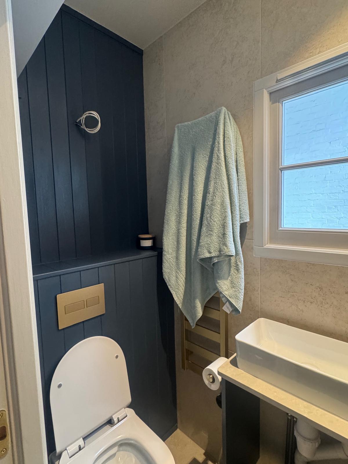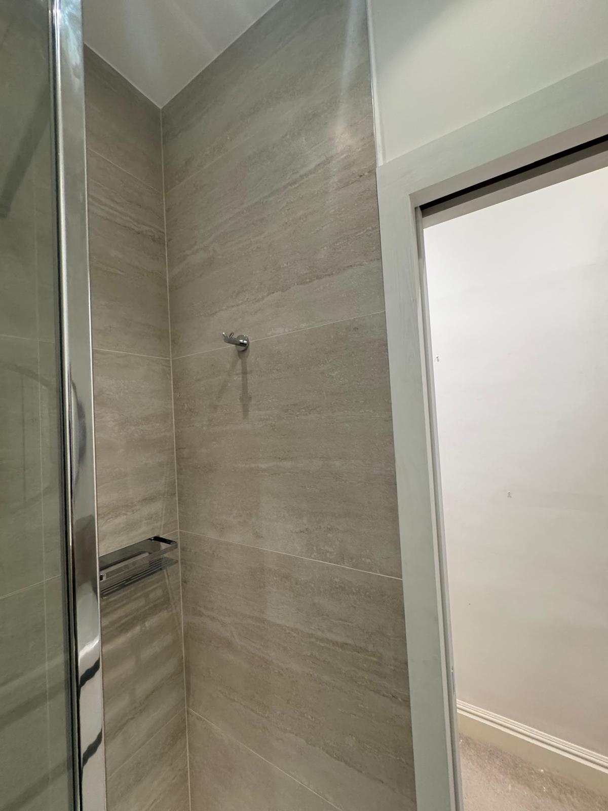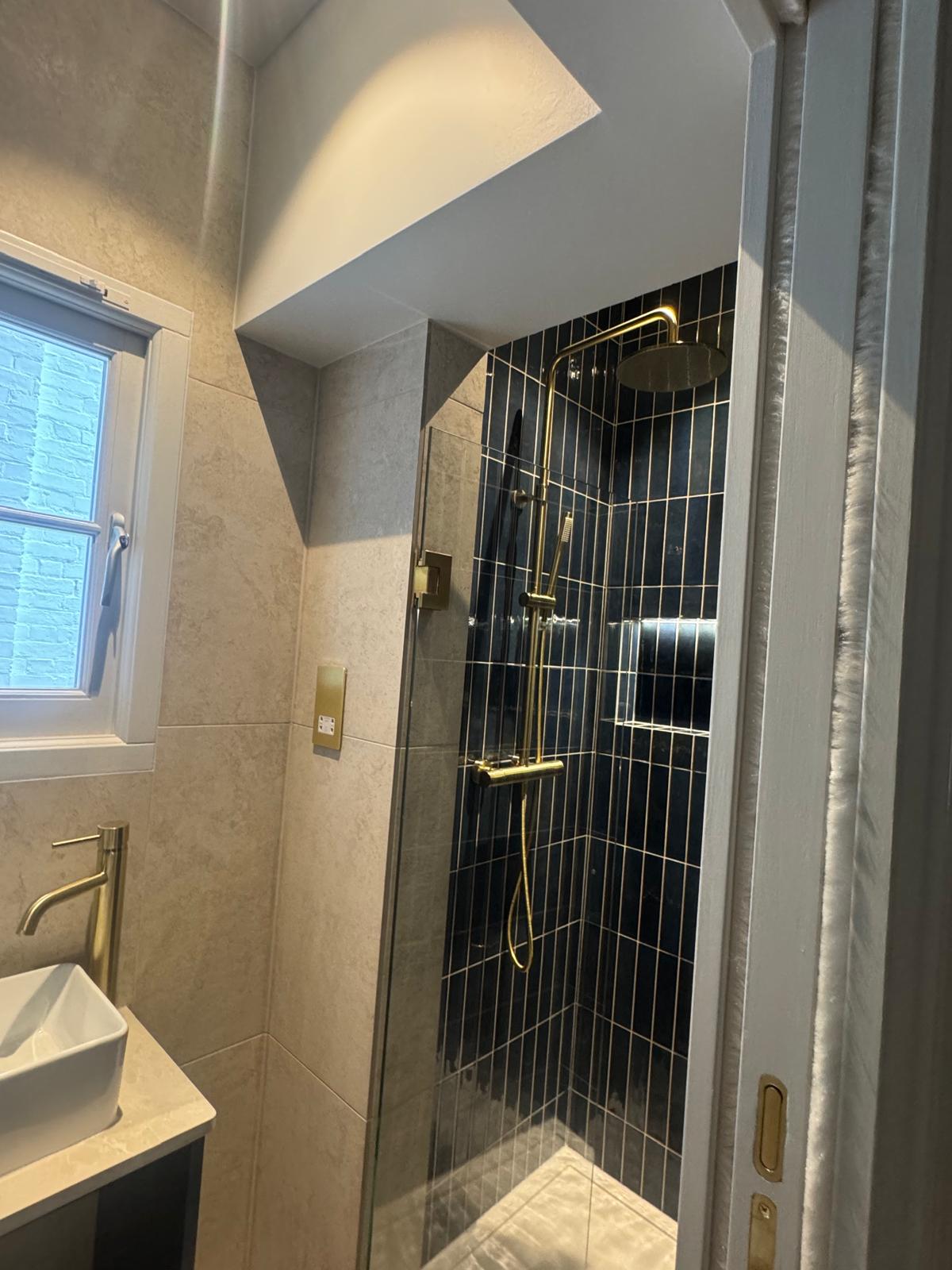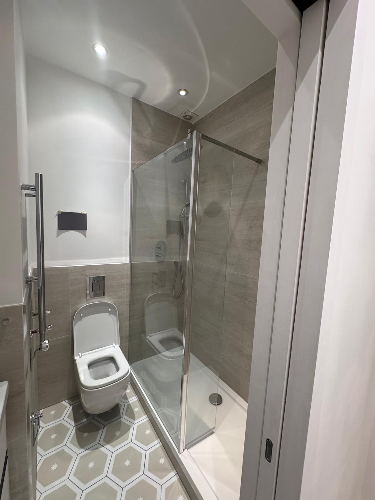 The bathroom was rebuilt from scratch. We started with new plumbing, waterproofing, and the installation of a SaniFlo system to suit the layout of the flat. Then came the tiling — carefully chosen for both style and practicality. Every corner was finished by hand to ensure perfect alignment. What used to be a tired, cramped space is now a bright, modern shower room that feels fresh, comfortable, and built to last.